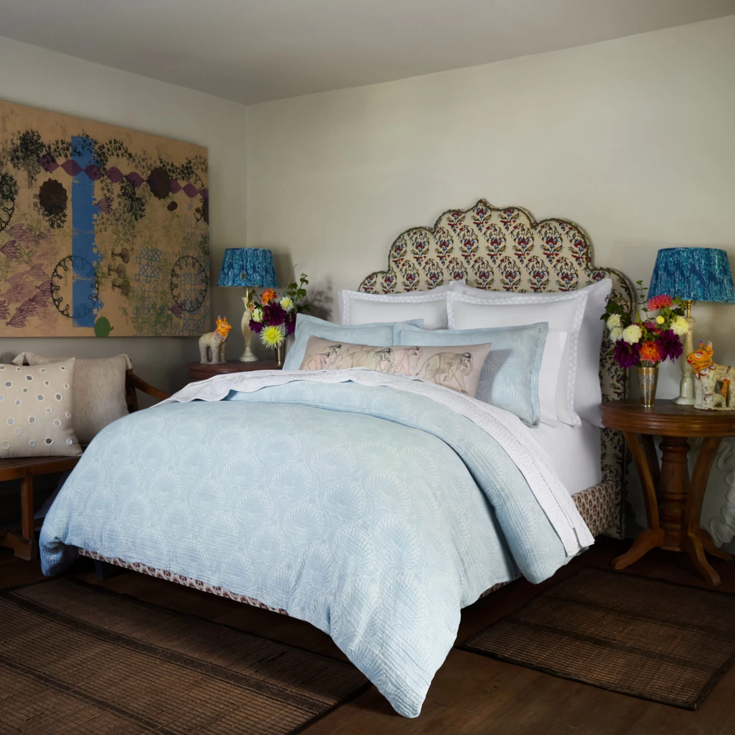 The Adesh Mist Duvet Set is made from 100% cotton. Finished with a misty blue hue and a woven flower motif, it blends texture and design to create unique visual appeal. Featuring a distinct balance of bold and bright from old-world traditions and new-world style, John Robshaw displays an updated spin on traditional, handmade textiles with a vibrant mix of sophistication and romantic allure. Dying, printing, and experimenting alongside the artisans to create these unique fabrics, John Robshaw helps preserve traditional block printing, hand-stitching, hand-painting, and hand-quilting textiles in India.