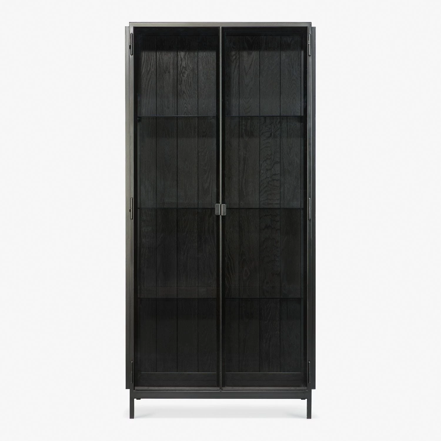 A fresh twist on traditional cabinetry. Steel, wood, and glass collide in this angular piece of minimalistic design. A black powder-coated steel frame is closed off with two glass doors that shield an open view of the interior shelving. Maximal storage opportunities offer a variety of options for home display.