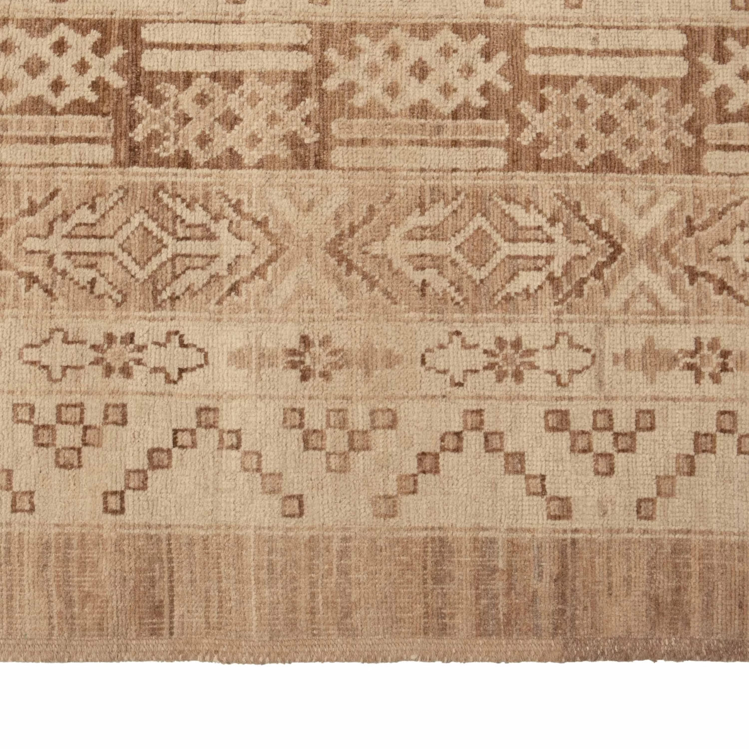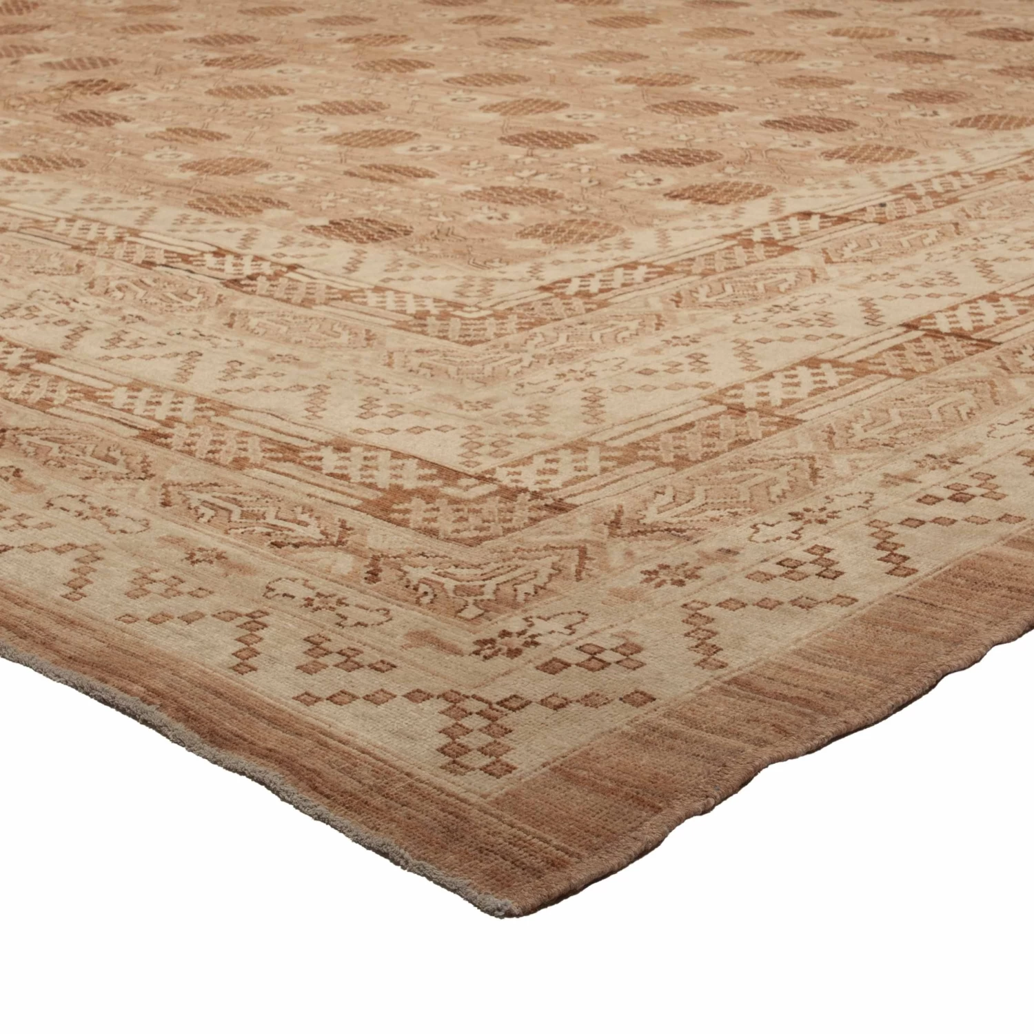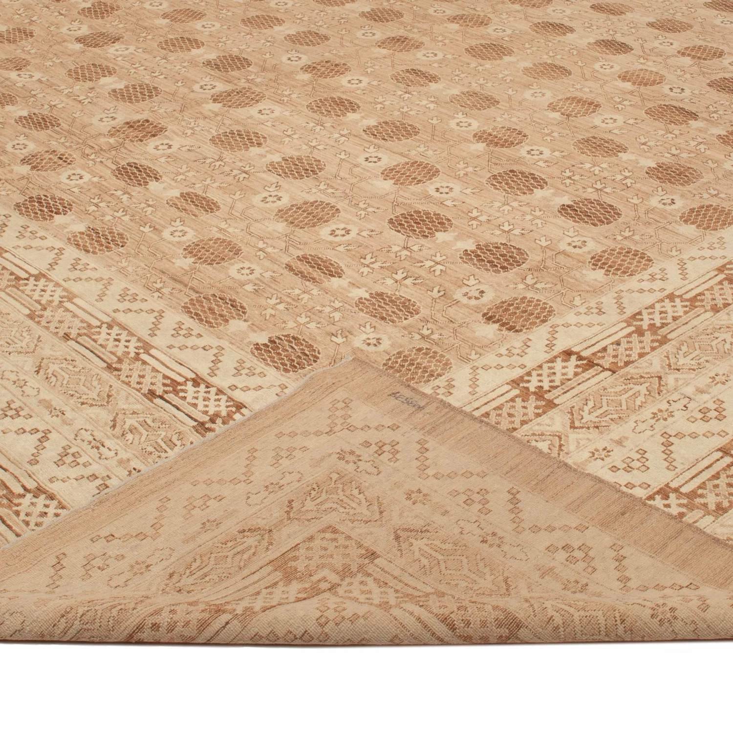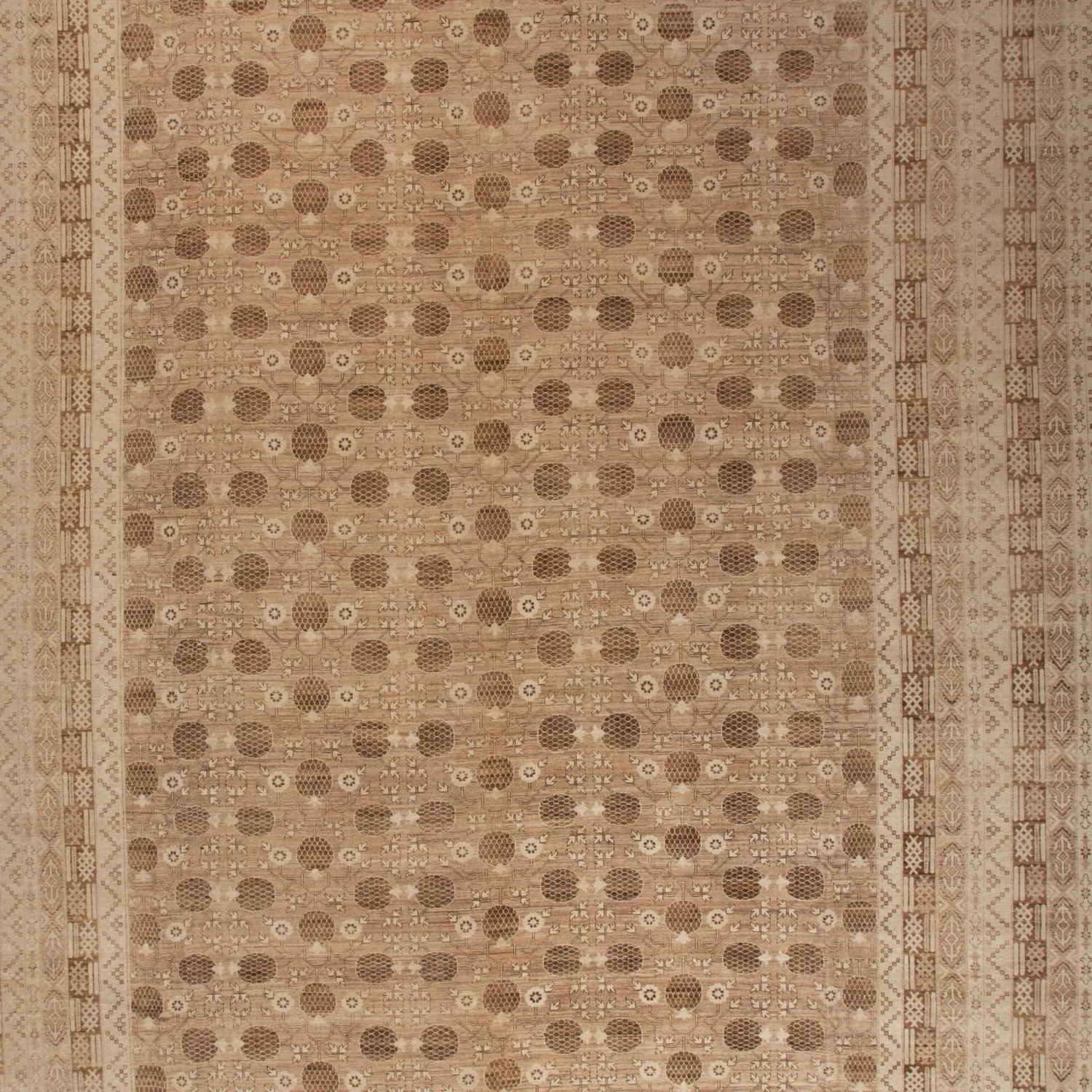 Hand-knotted from wool, this oversized rug features a traditional Central Asian design in a muted, low-contrast palette.