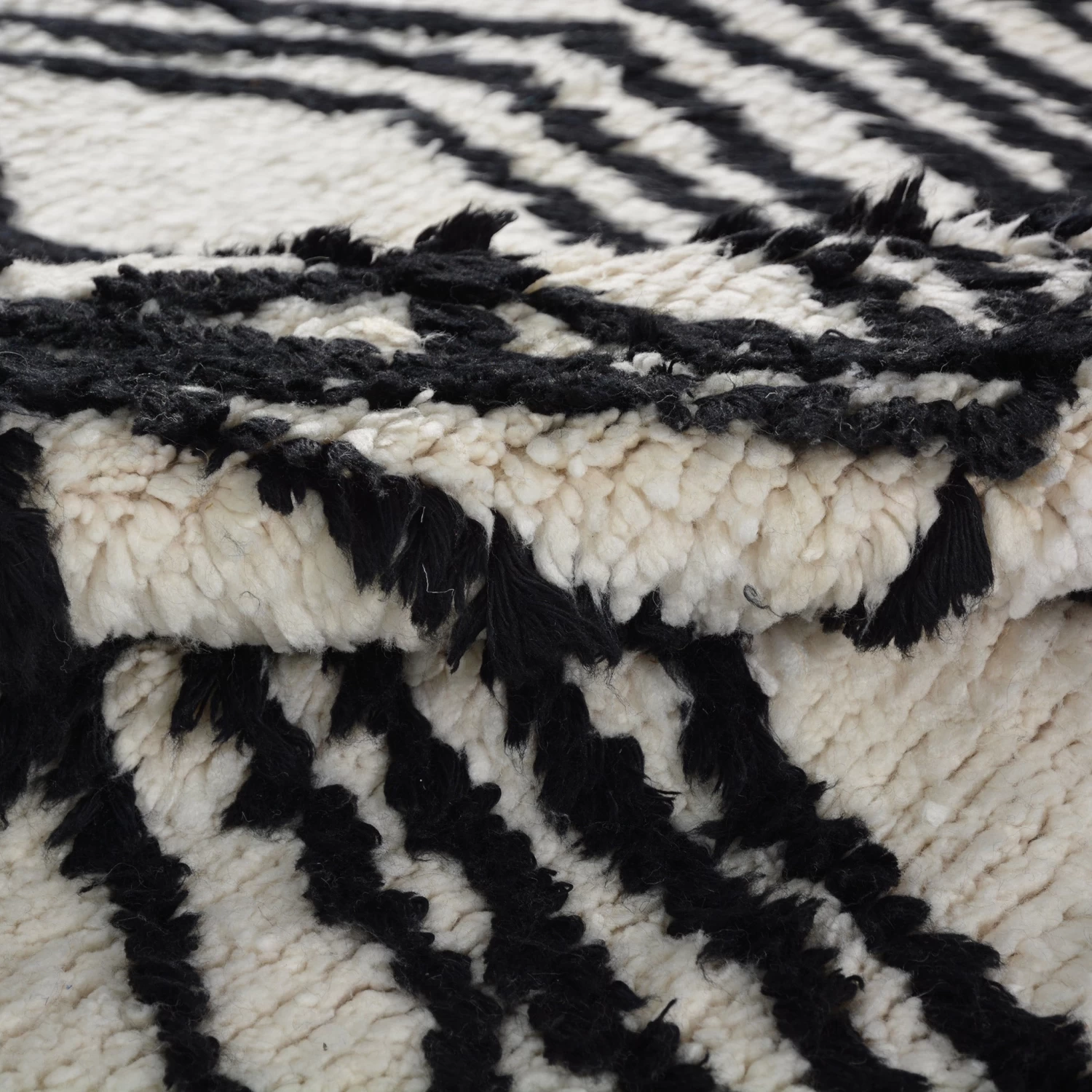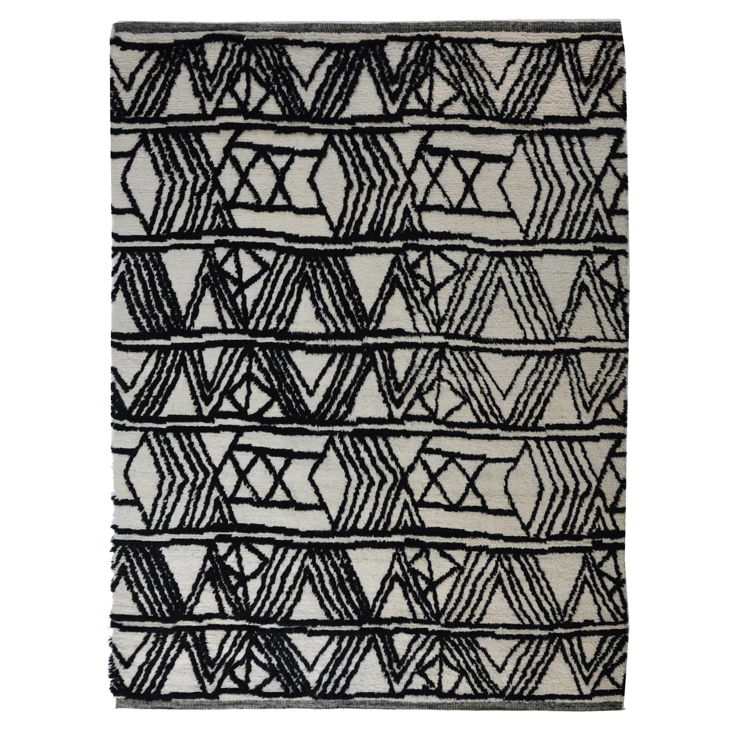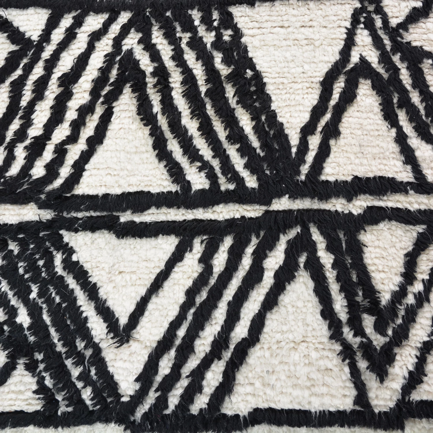 This Moroccan Style Rug – 9′ x 12′ showcases a stunning combination of black and ivory tones, creating a stylish and inviting ambiance in any room. This modern Moroccan rug features a geometric tribal pattern crafted in a rich plush texture. Hand-knotted using the finest wool fibers, this contemporary Moroccan rug ensures exceptional quality and durability.