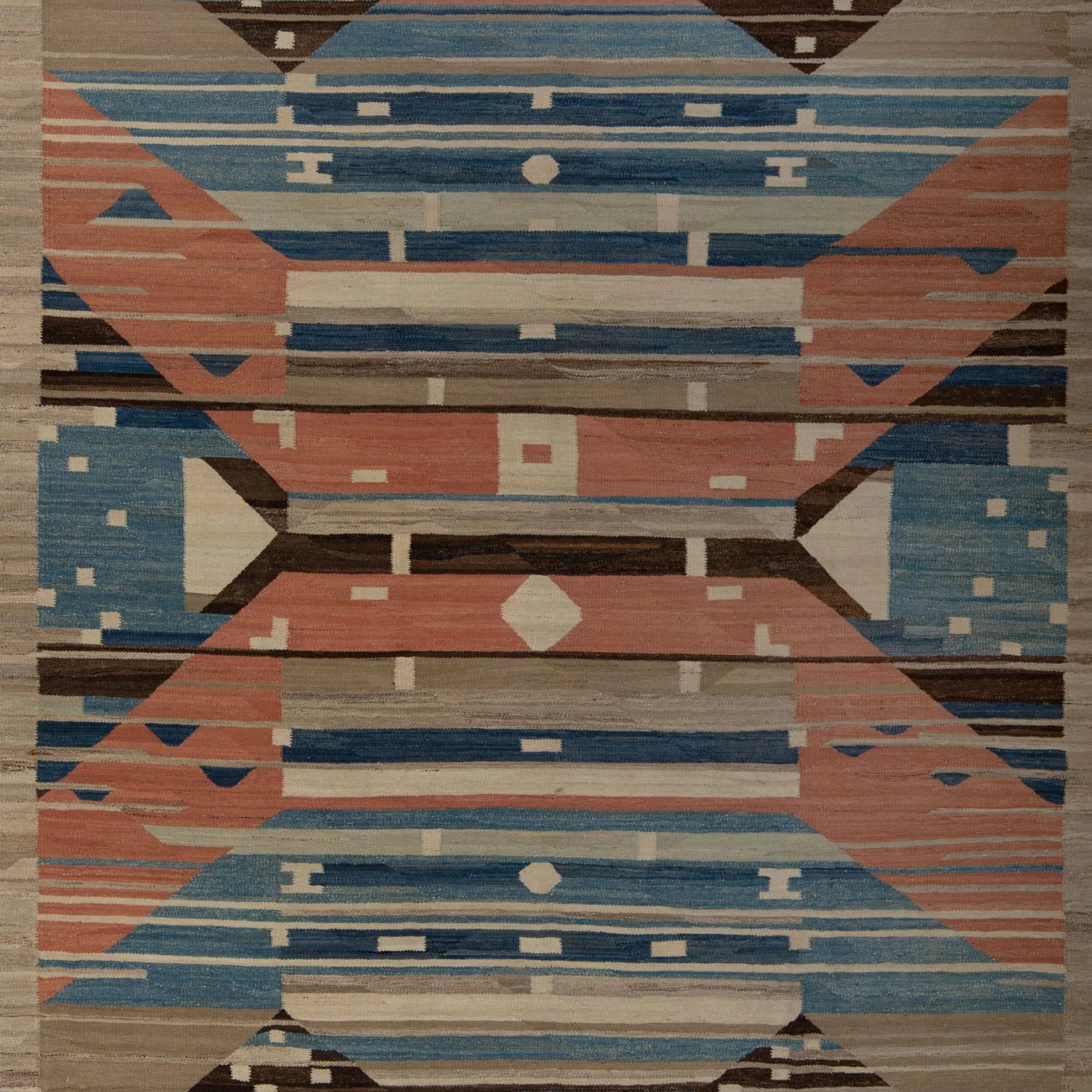 The Blue and Pink Modern Kilim Wool Rug – 9′ x 11’7″ is a skillfully handwoven rug from India. Its complex geometric pattern showcases a symmetrical diamond-like motif, adorned with earthy shades of brown, blue, beige, and red, along with contrasting touches of white. Made from wool, this high-end contemporary rug exudes a rustic yet bold aesthetic, adding a strong visual element to any room.