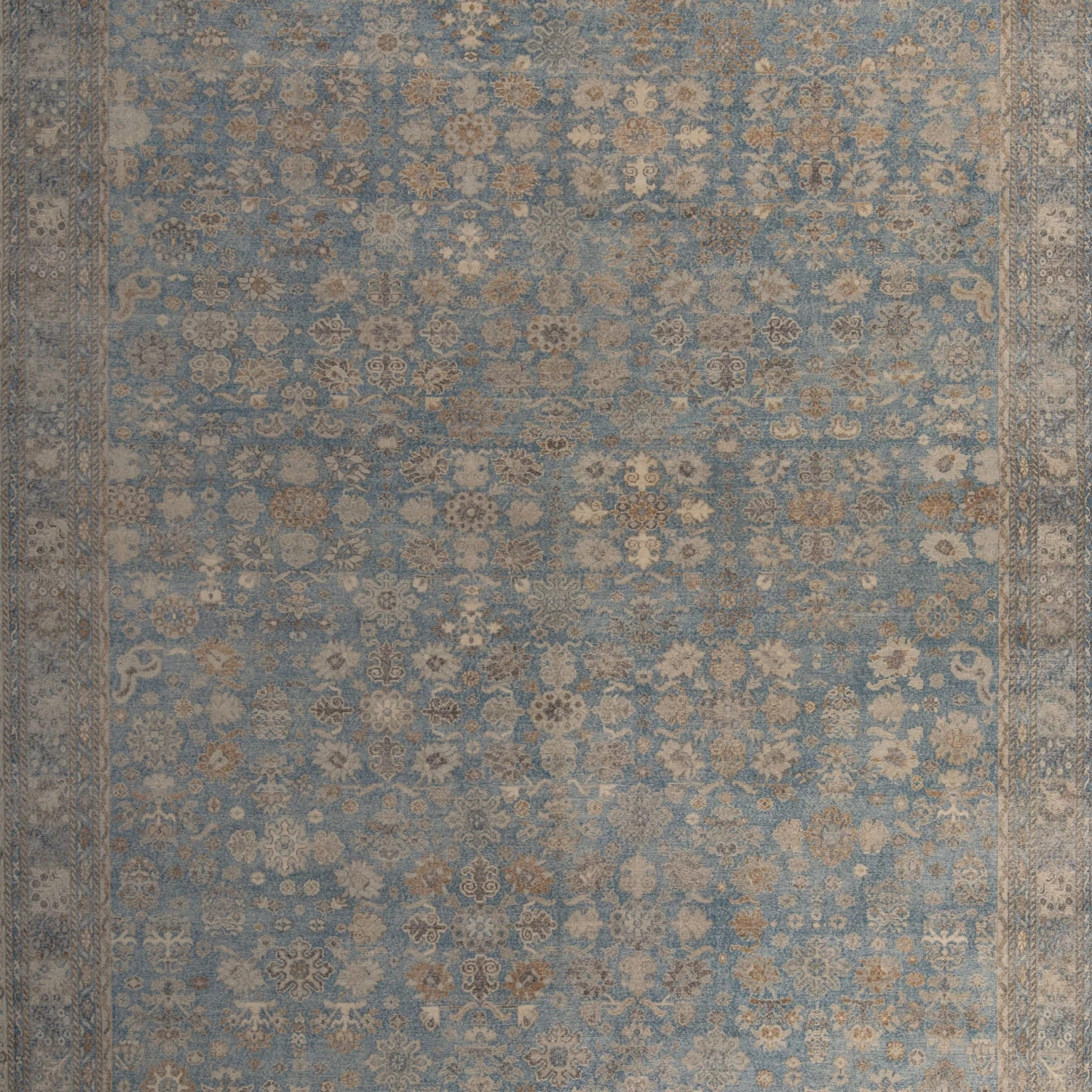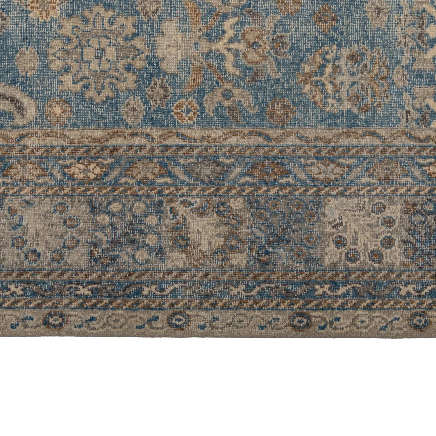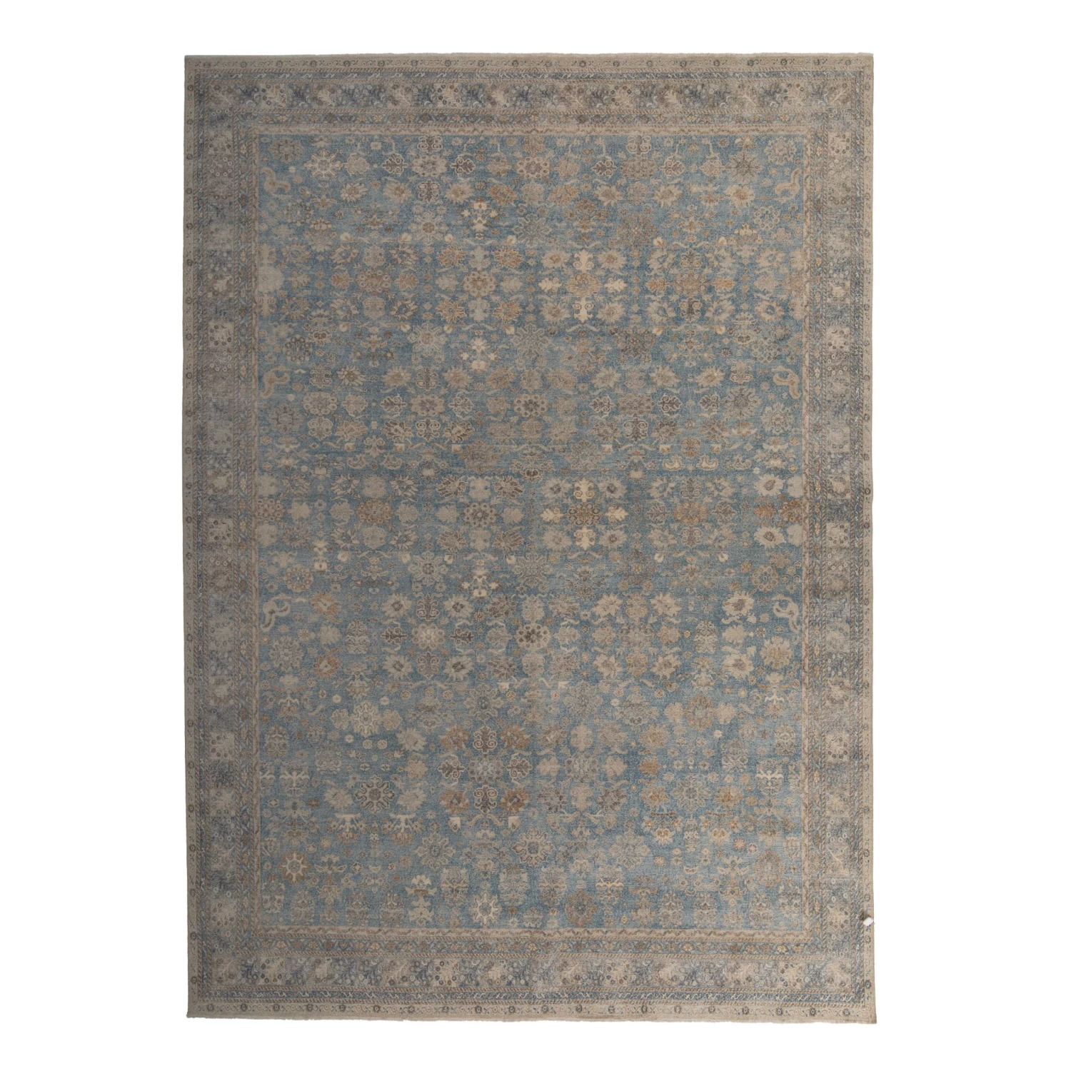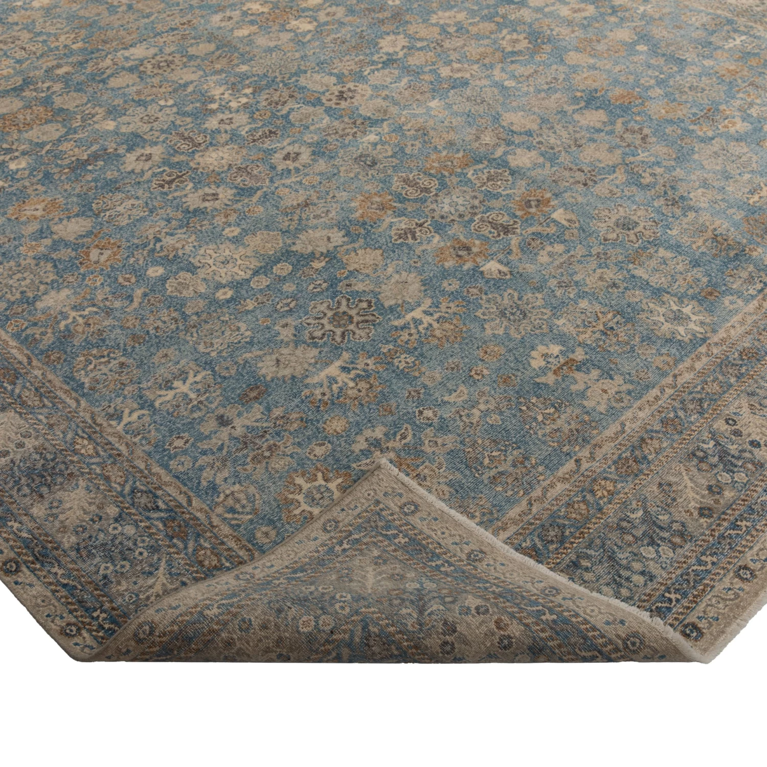 This Blue Distressed Transitional Wool Rug – 10’x14′ is hand-knotted by rug artisans in India to create a traditional floral design in a neutral modern color palette of bluebell blue, grey, taupe, and cream throughout the entirety of this one-of-a-kind rug. Enclosed with an intricate border, this area rug showcases the true art form of artisan rug making.