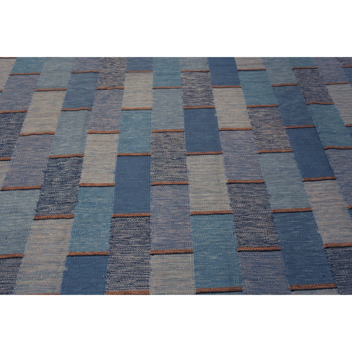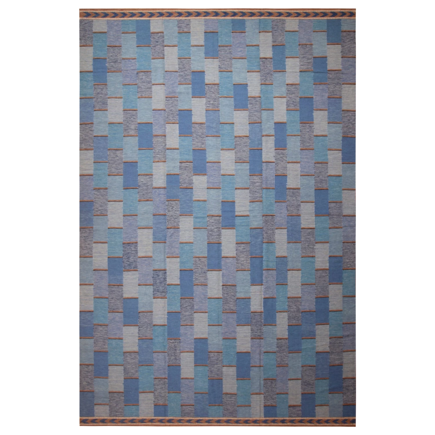 Recapturing acclaimed mid-century modern style, this Blue Geometric Swedish Style Wool Kilim Rug – 11’8″ x 17’10” features a bold geometric pattern in neutral blue hues for a balanced color palette. Handwoven from durable wool, this minimalist Scandinavian Deco geometric rug showcases dynamic movement with an all-over design and sophisticated aesthetic. Kilim rugs are traditional flatwoven foundations that are cherished for their versatility and lightweight nature. This oversized kilim rug is a rare size and one to be celebrated by collectors.