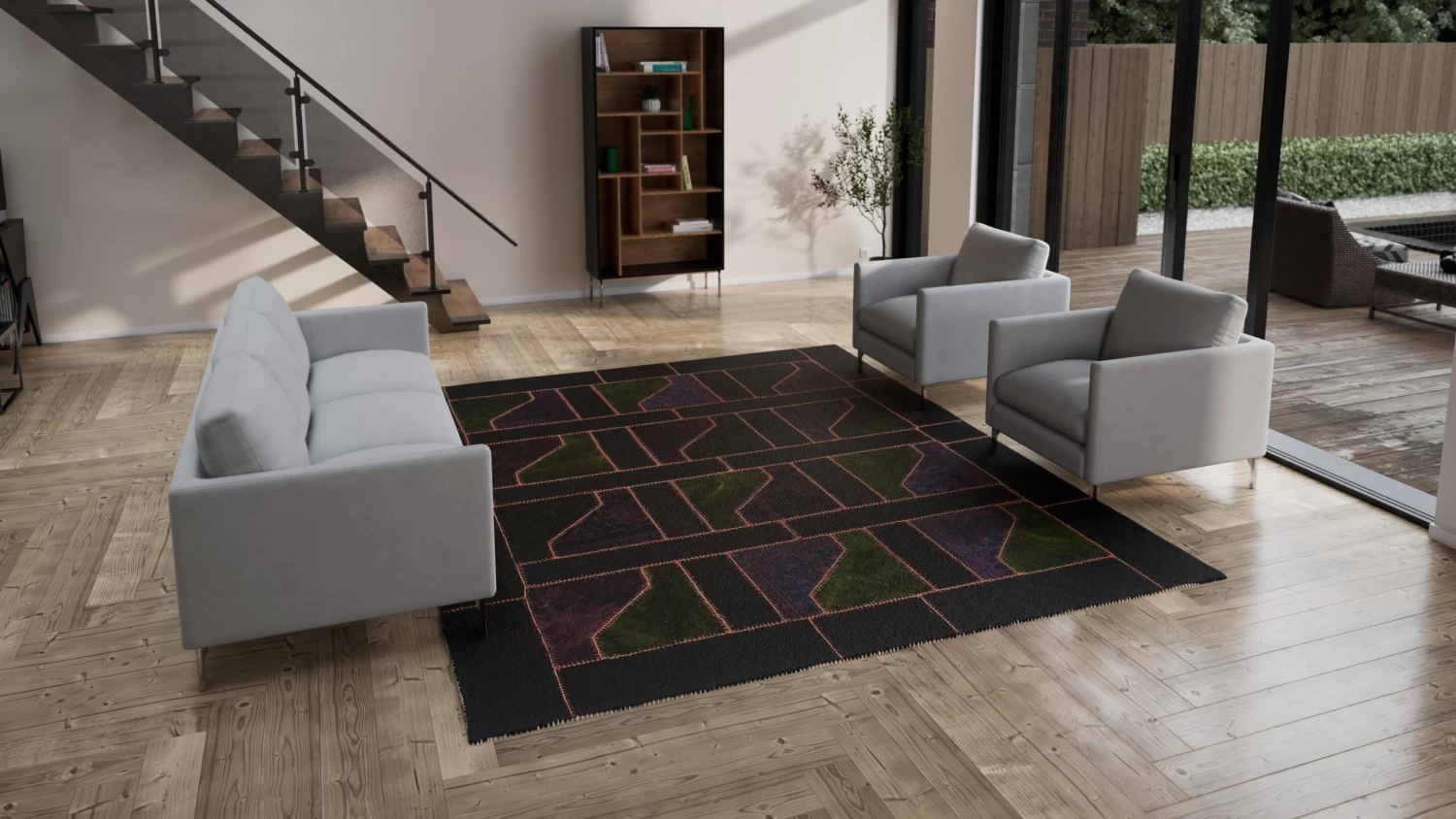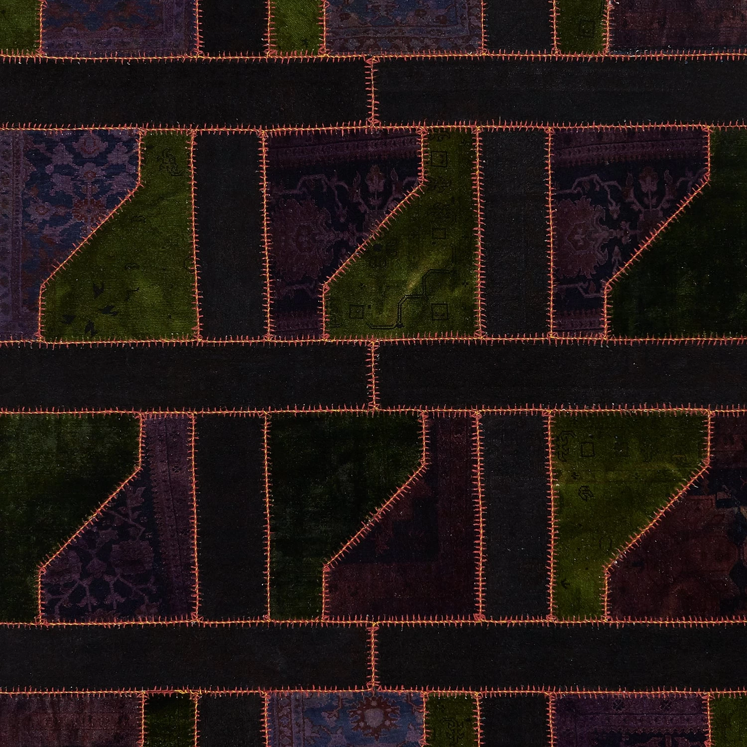 Hand-knotted in Turkey, this one-of-a-kind rug features an unusual geometric pattern created with patchwork pieces of upcycled rugs and vibrant over-stitching to draw the eye. The ideal vintage rug for a bohemian and eclectic home.