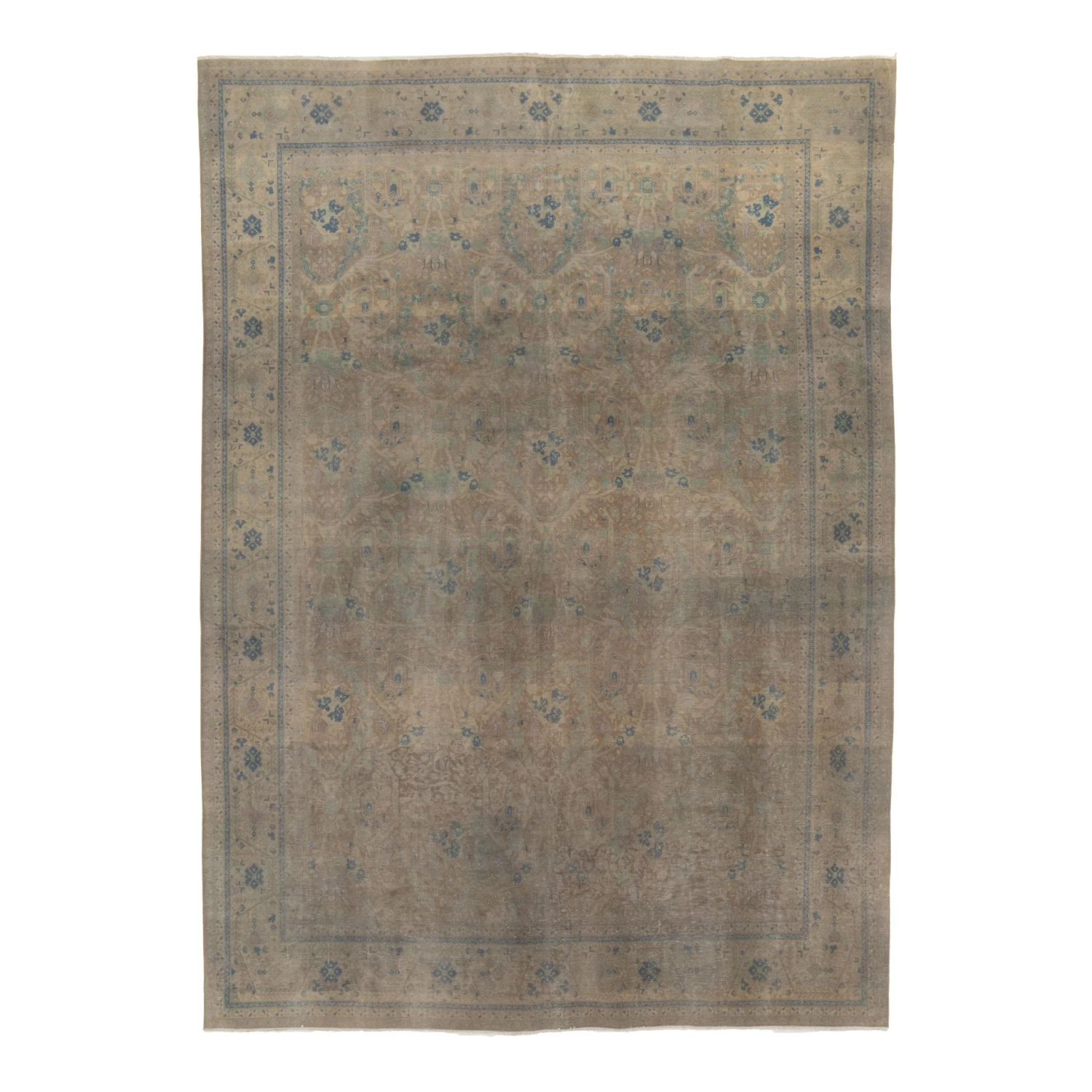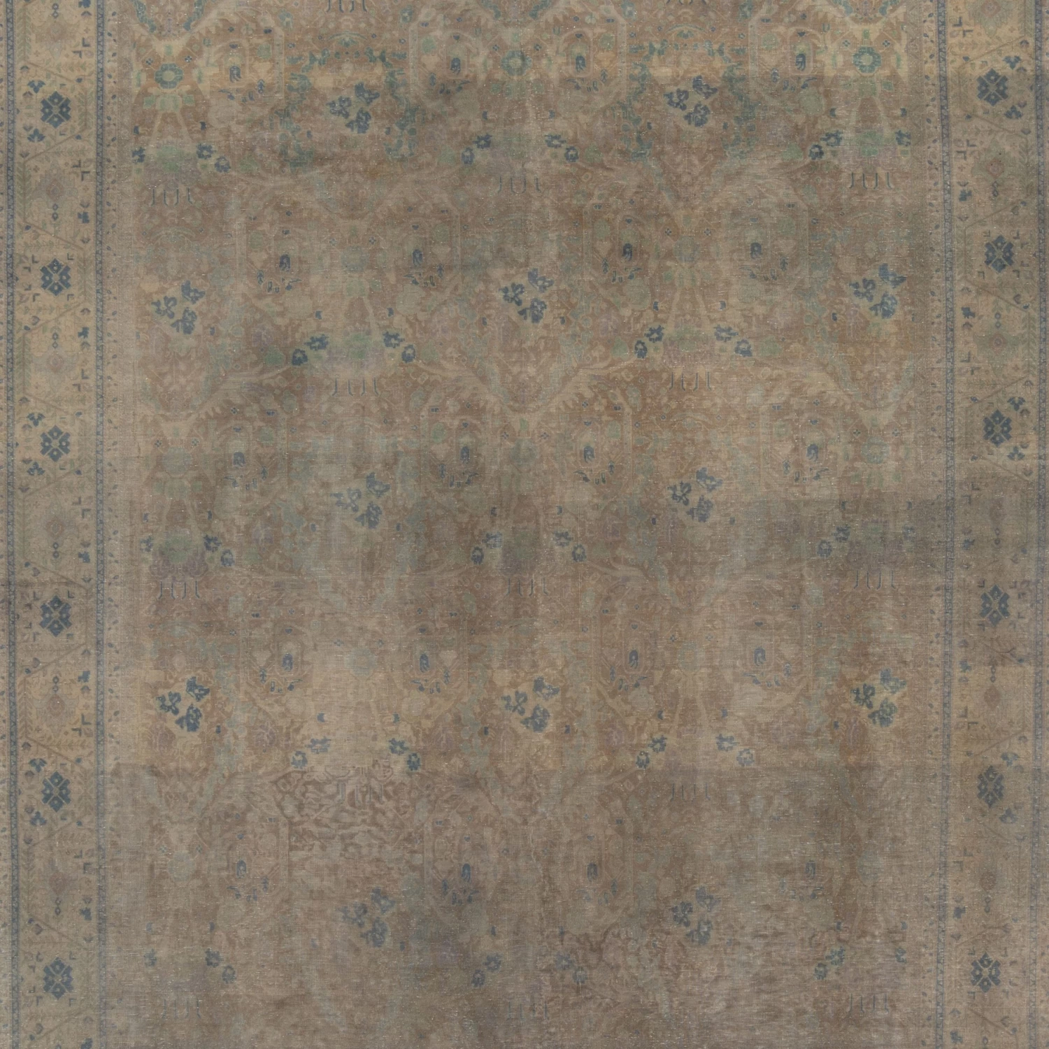 This Blue Tabriz Vintage Rug – 8’3″ x 11’6″, and showcases a symmetrical and consistent pattern in muted earth tones with hints of blue. Hand-knotted in Central Asia, this traditional rug features a vintage look and worn appearance, adding character to any space. Crafted from high-quality wool, its repetitive geometric and floral design is bordered by a complementary pattern. This exquisite and timeless rug is perfect for interior settings with traditional or rustic aesthetics.