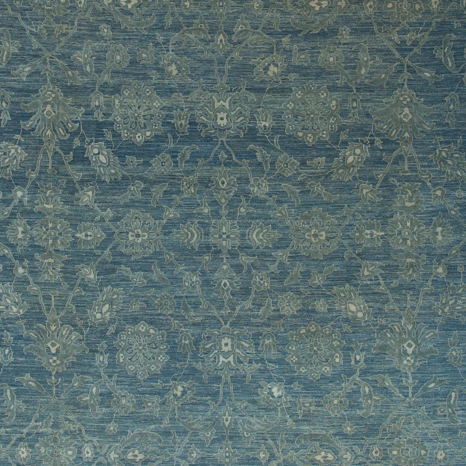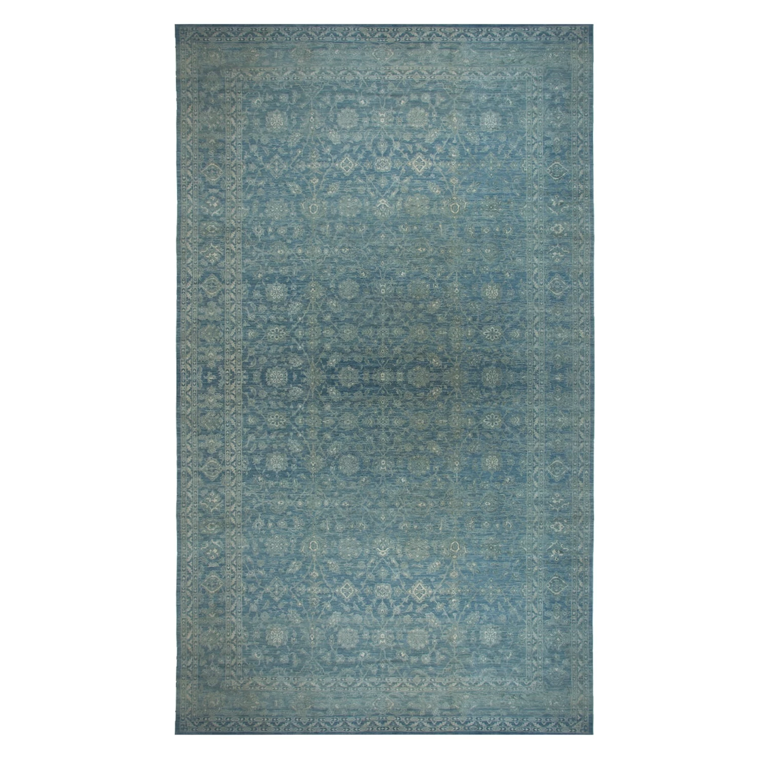 This oversized rug is featured in a collection of over forty distressed rugs that permutate vintage styles into a variety of modern color palettes. Each oversized rug is transformed by skilled artisans in Pakistan through cycles of washing, sunning, and shearing – making modern iconic motifs from Turkish and Persian rug designs. Perfect for a large, sun-drenched room. Hand-knotted from silk & wool.