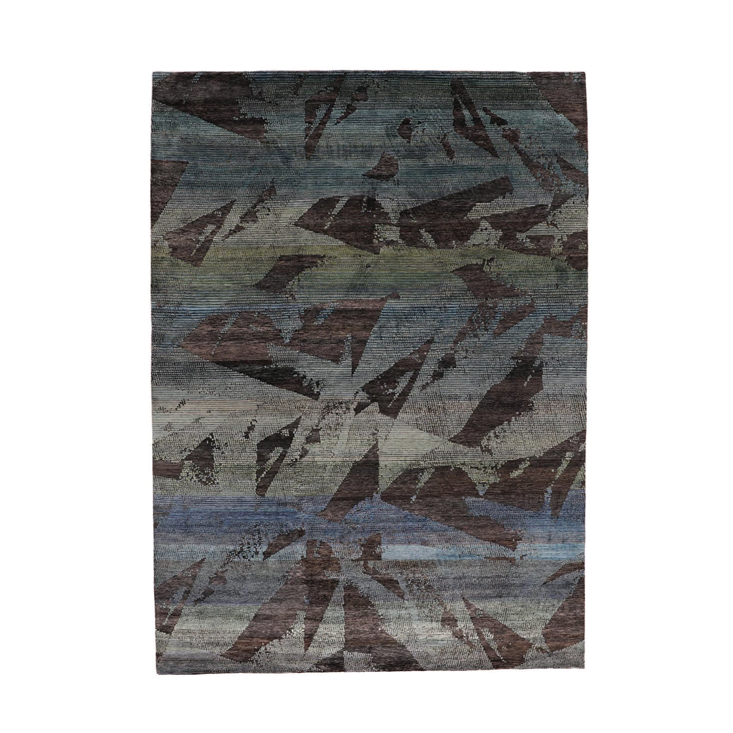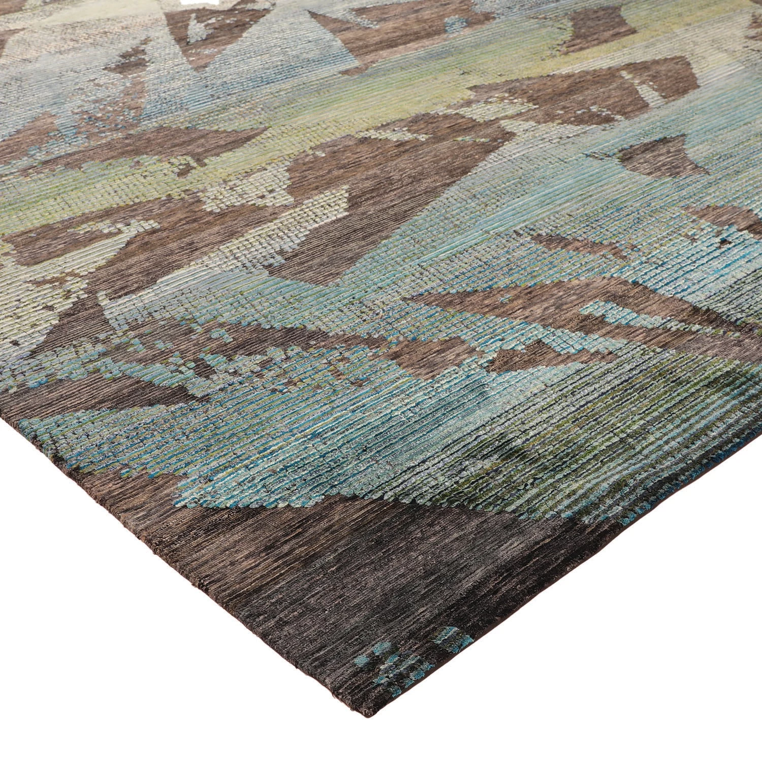 This Modern Binsa Silk Rug – 10′ x 13’1″ is an abstract design handmade from soft silk in metal tones of blue, green, brown, and grey that serves as a contemporary centerpiece in your home. The magic happens when the natural course silk is washed and treated to create an extraordinary shiny and silky texture that is then woven to make a one-of-a-kind masterpiece. Handwoven in Nepal from 100% silk.