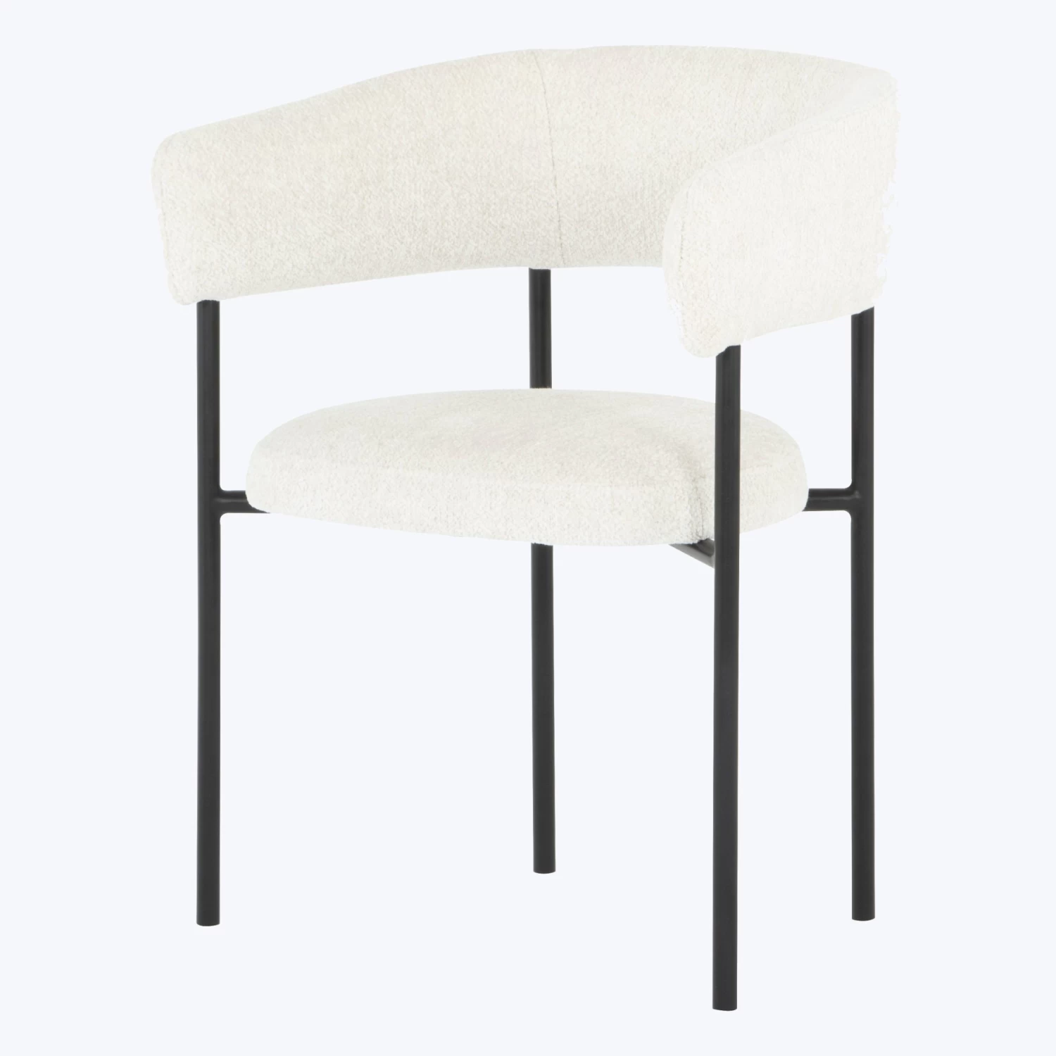 The stylishly rounded backrest of the Cassia Dining Chair brings a soft edge to your dining room. Sitting on modern thin matte black metal legs, this dining chair with arms features an extra-padded boucle fabric seat and softly curved back for ultimate comfort. These upholstered arm chairs are perfect for enjoying long, leisurely dinners.