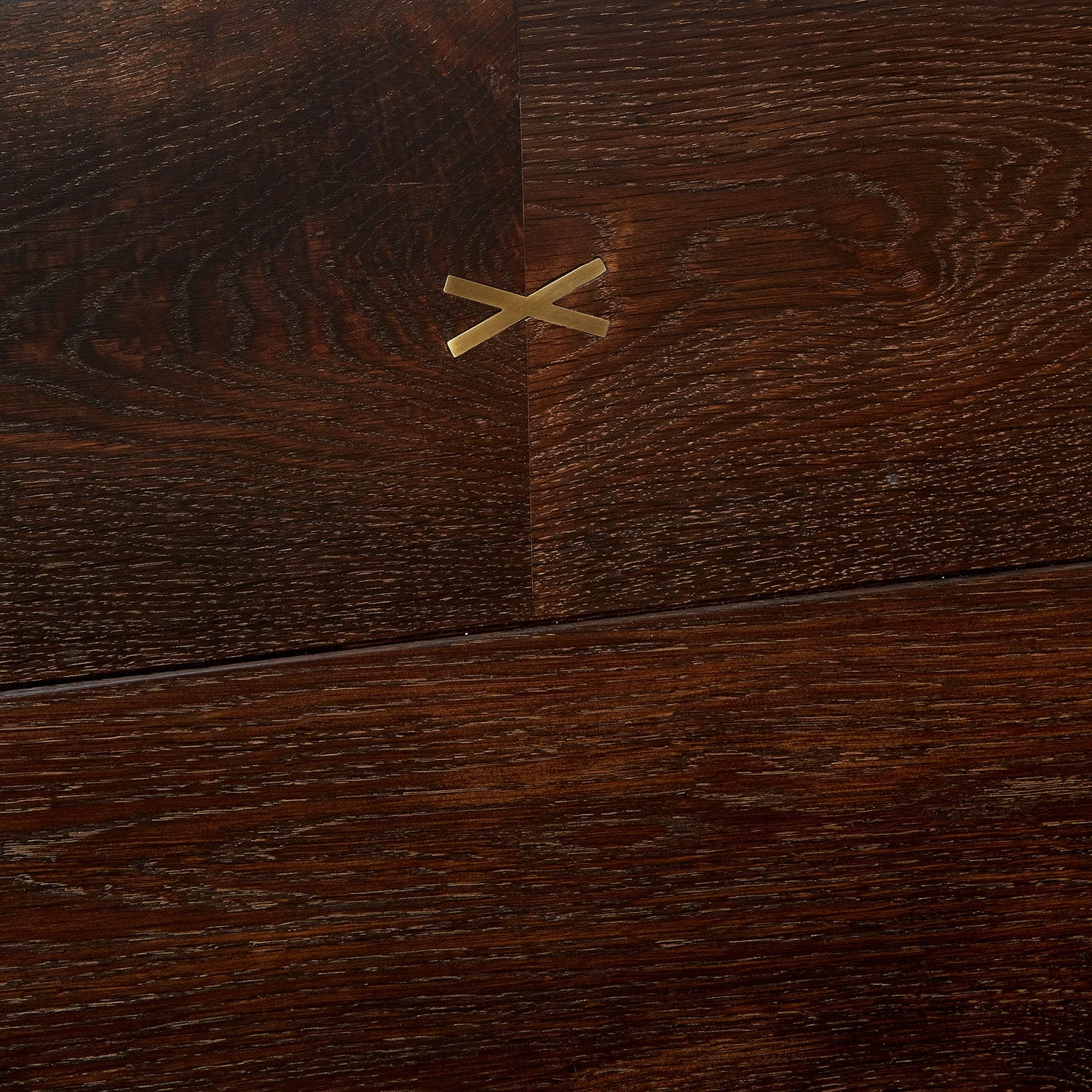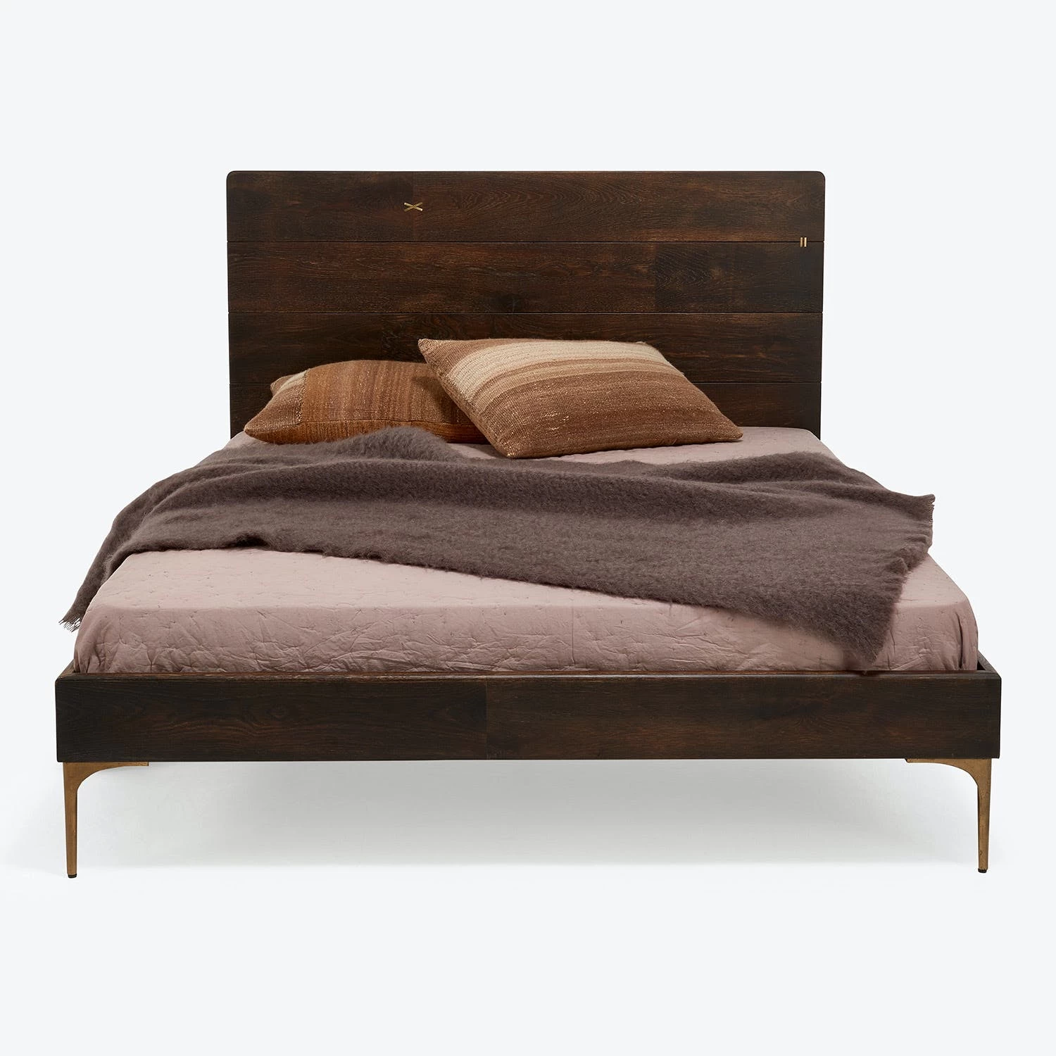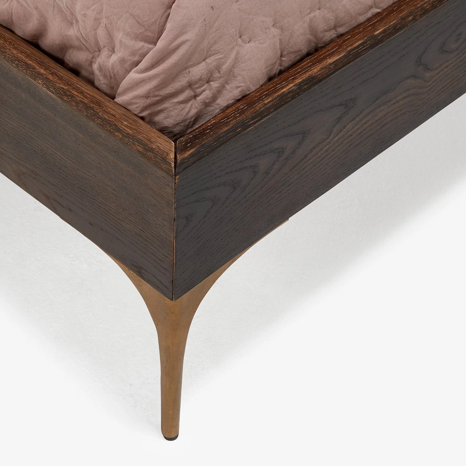 Exclusively at ABC, the bed is handcrafted from seared oak with a brass criss-cross inlay design. Smooth, bronze legs create a streamlined aesthetic. Will develop its own patina over time.