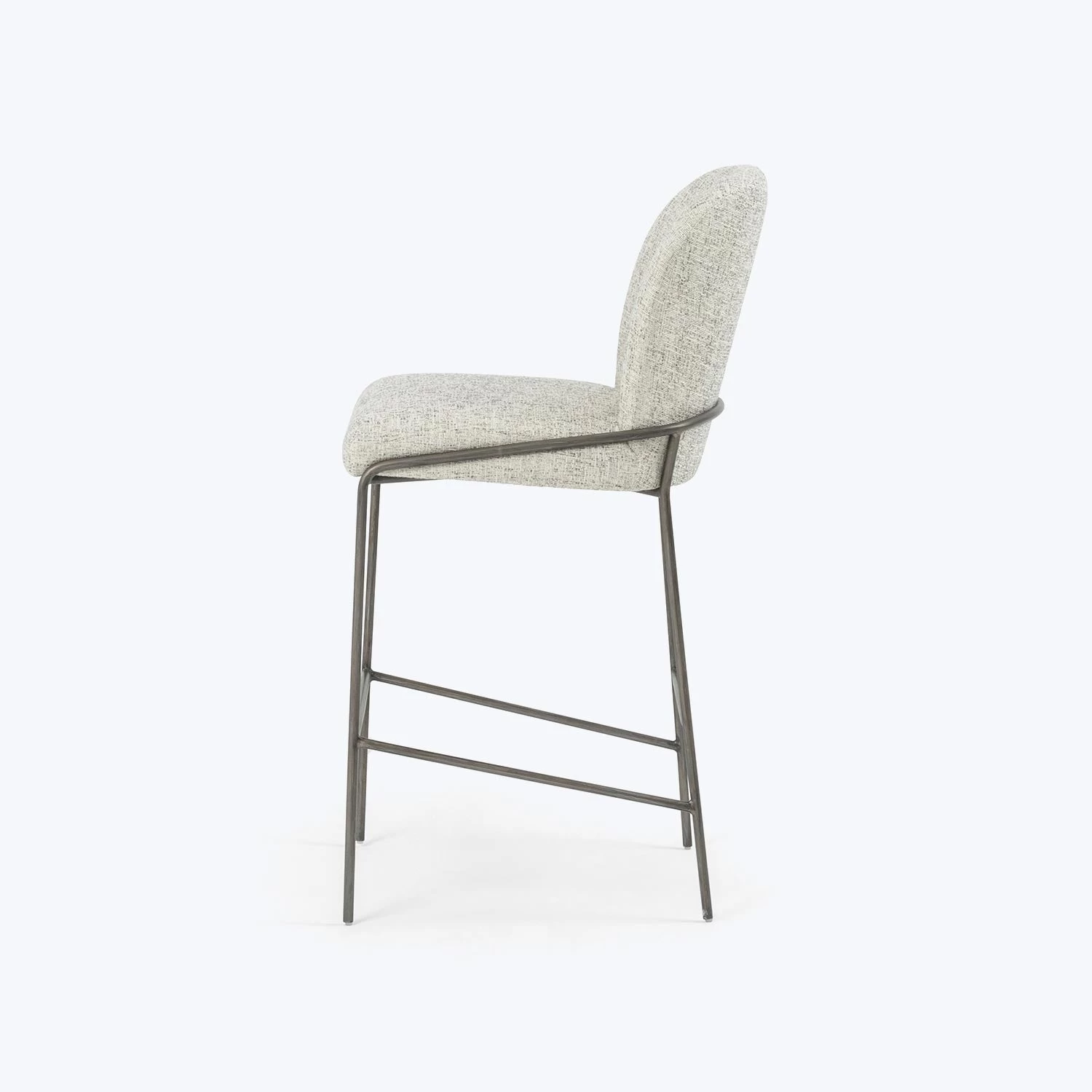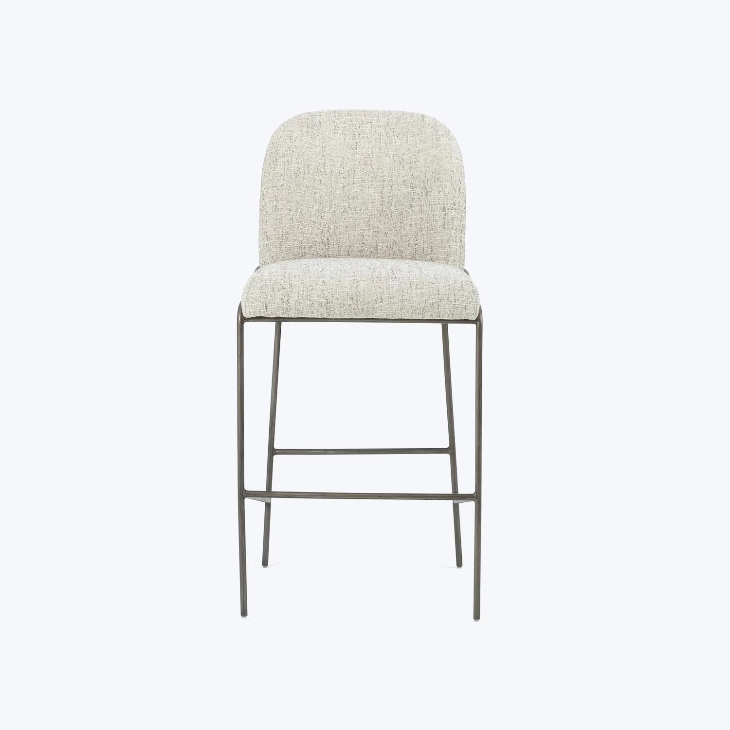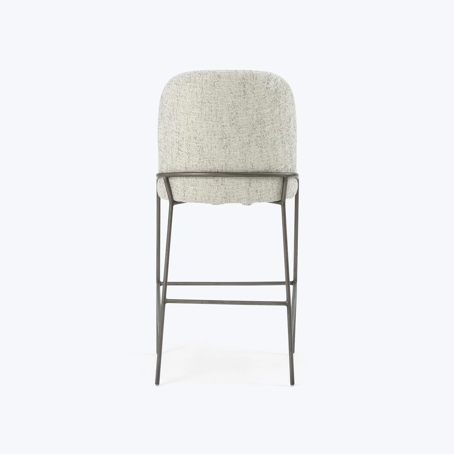 This bar stool features a curved, minimalist frame expressed in black iron. Naturally-shaded performance fabric adds a dimension of practicality and texture to a dining space