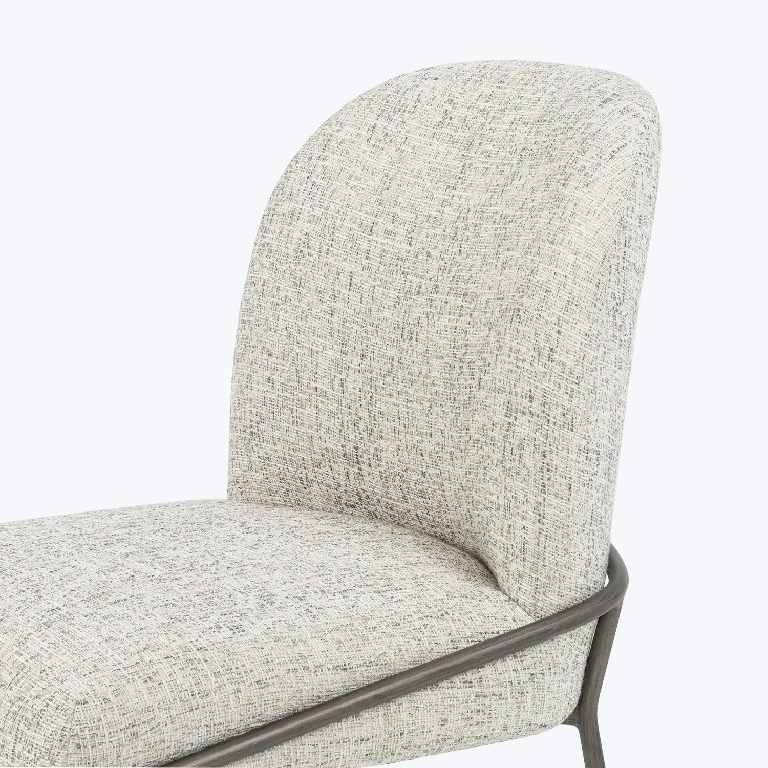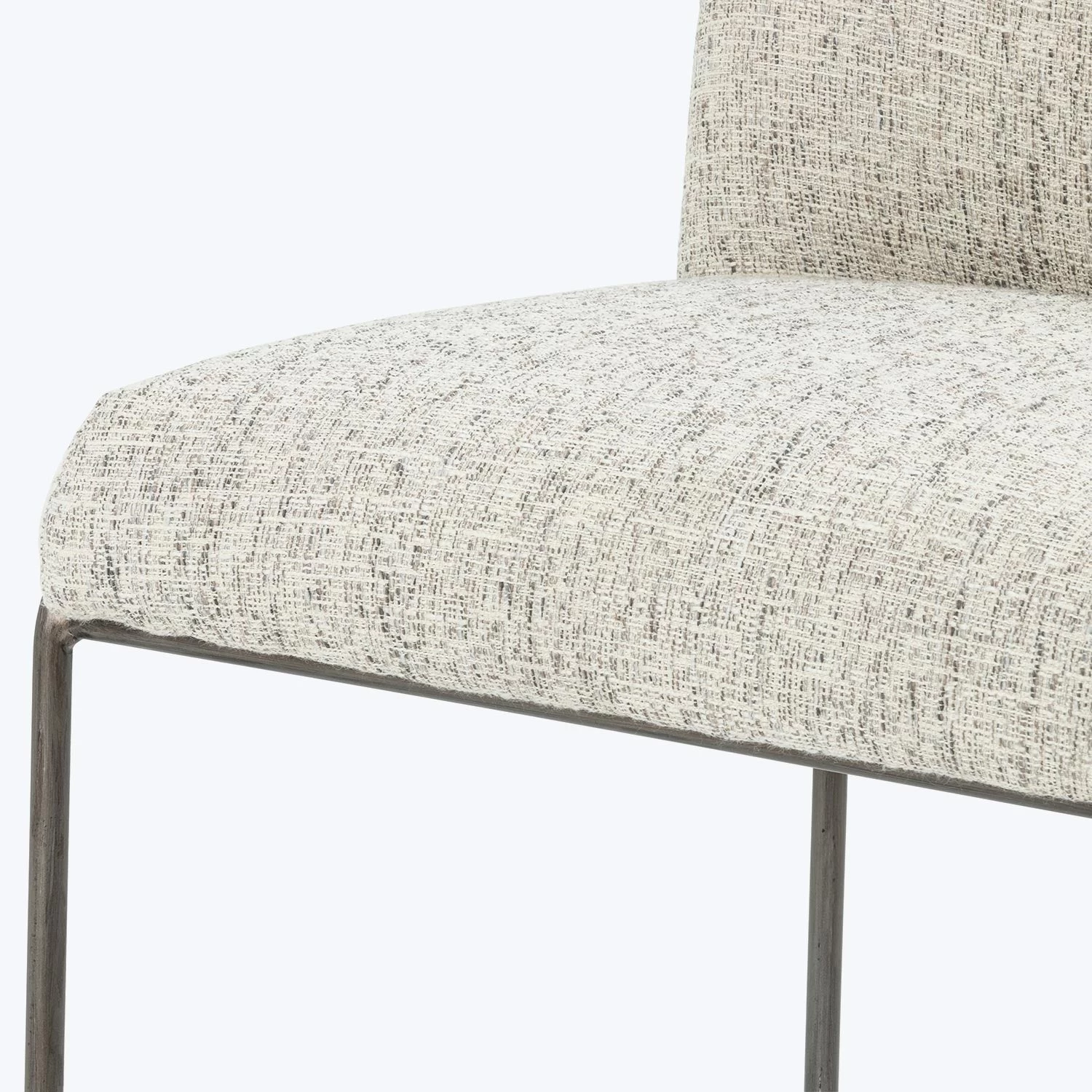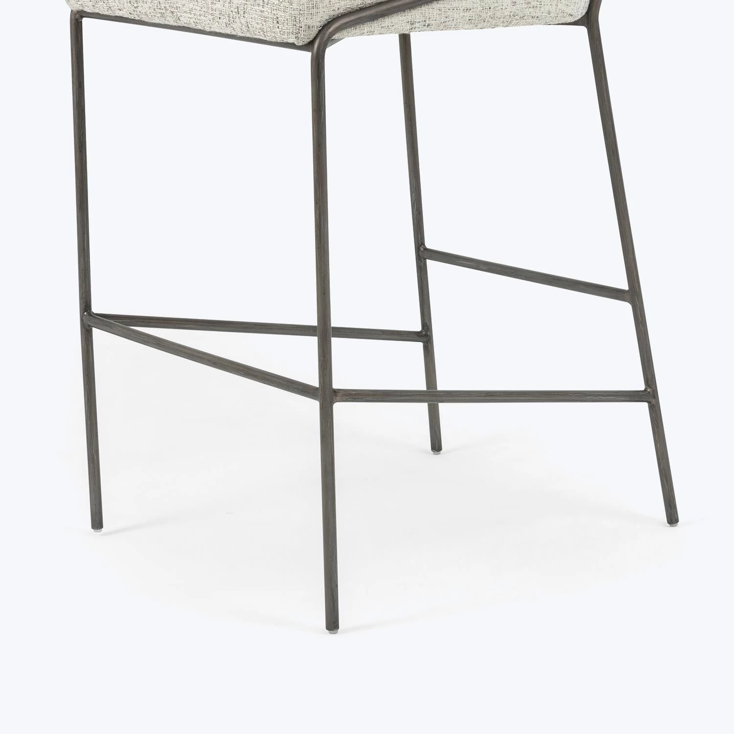 This bar stool features a curved, minimalist frame expressed in black iron. Naturally-shaded performance fabric adds a dimension of practicality and texture to a dining space