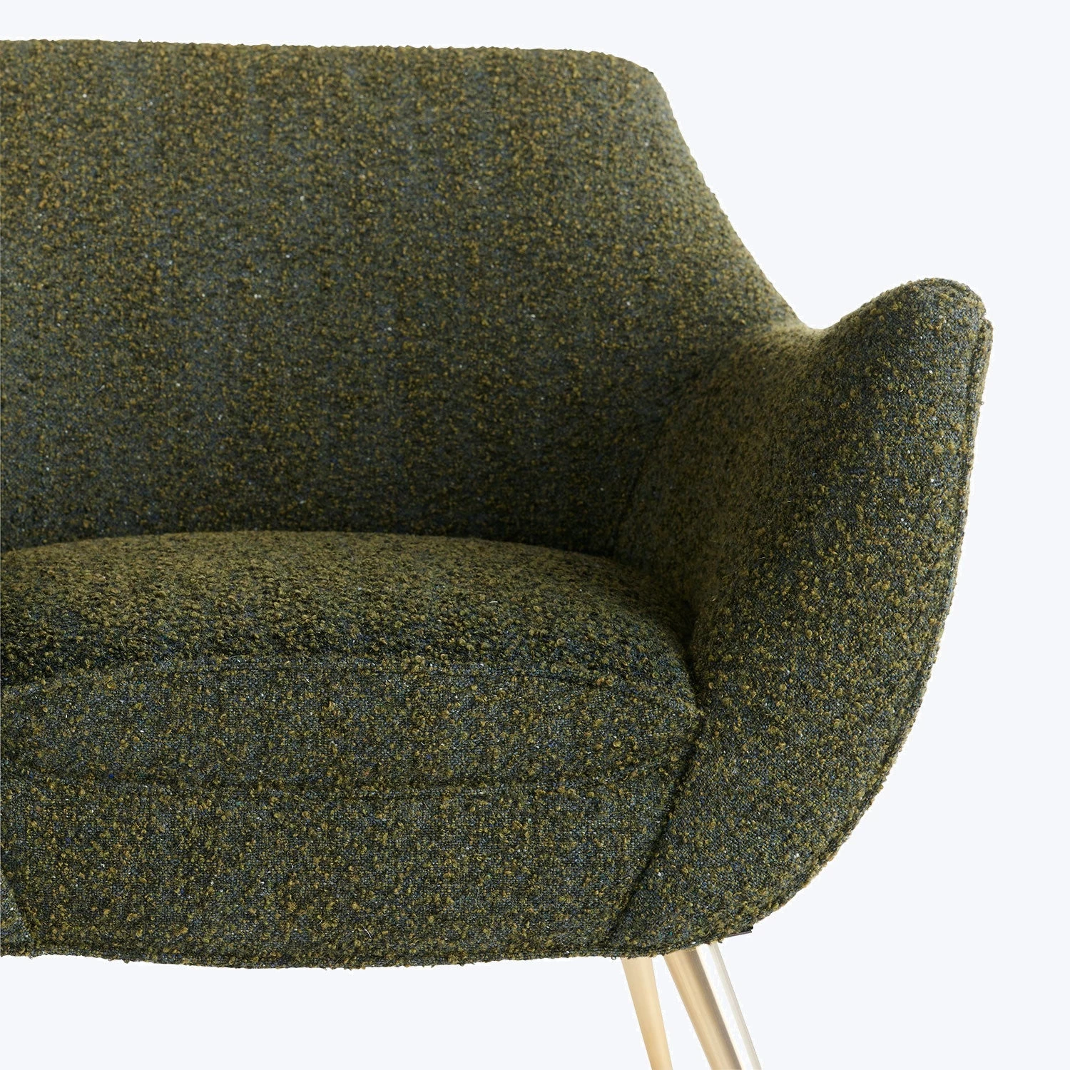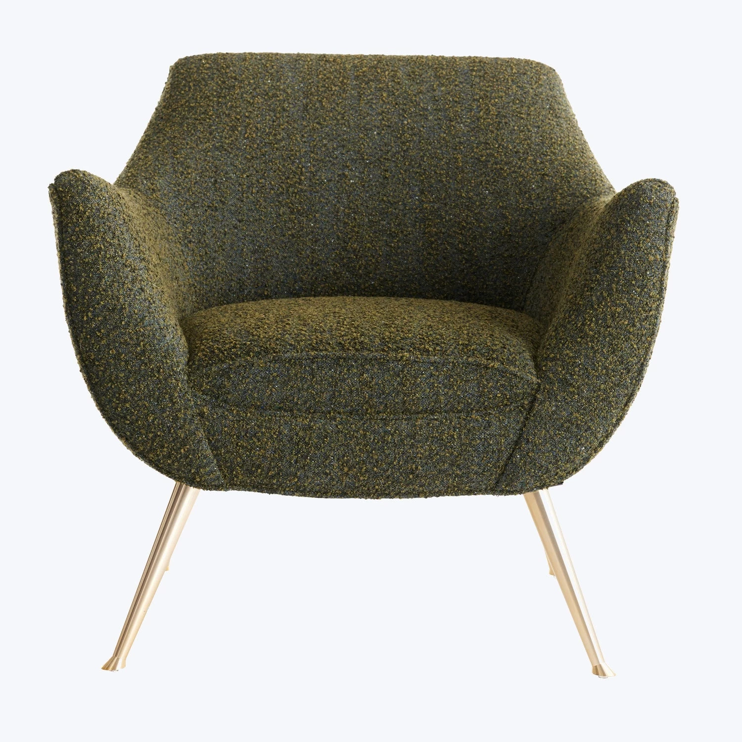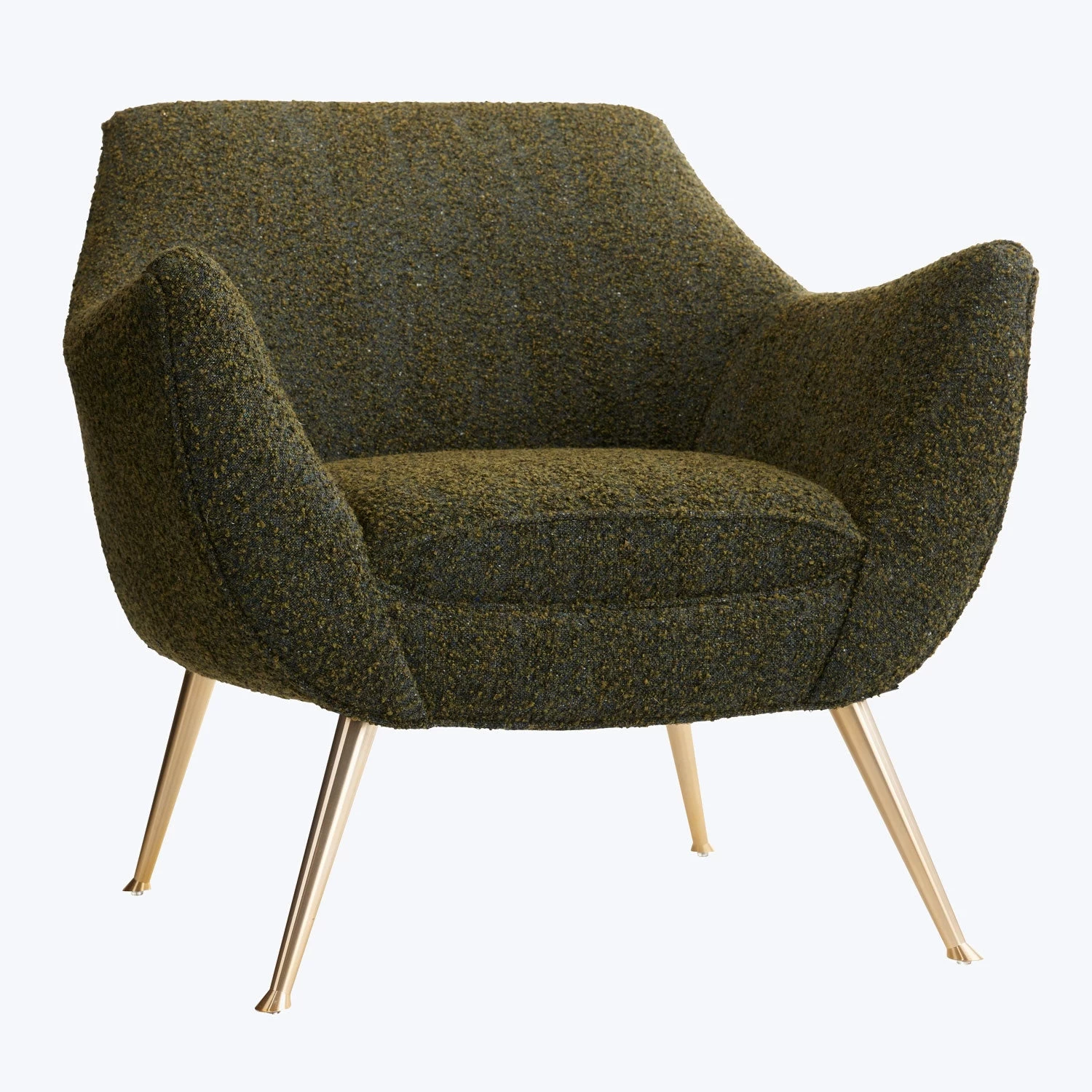 Inspired by mid-century modern design, this chair features a curved design with swooping arms and a mid-rise back. Tapered iron legs are angled outward and finished in an antique brass to complete the look.
