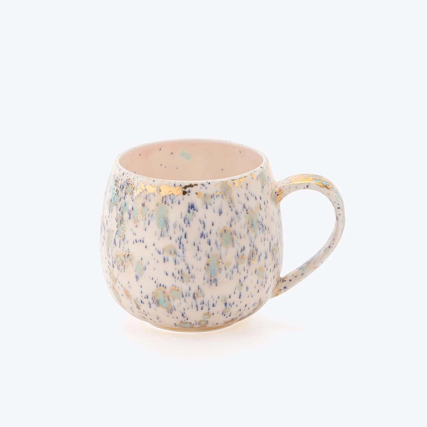 Exquisitely one-of-a-kind, the Dafne Chubby Mug is surrounded by a gold rim and handle with subtle sprinkles of light blue, teal, black, and golden dots. Unique, elegant, and whimsical, the Dafne Porcelain Dinnerware Collection creates a golden garden on your table. Originating from Italy, Coralla Maiuri is a world-renowned artist who creates hand-crafted dinnerware and home decor inspired by natural elements.