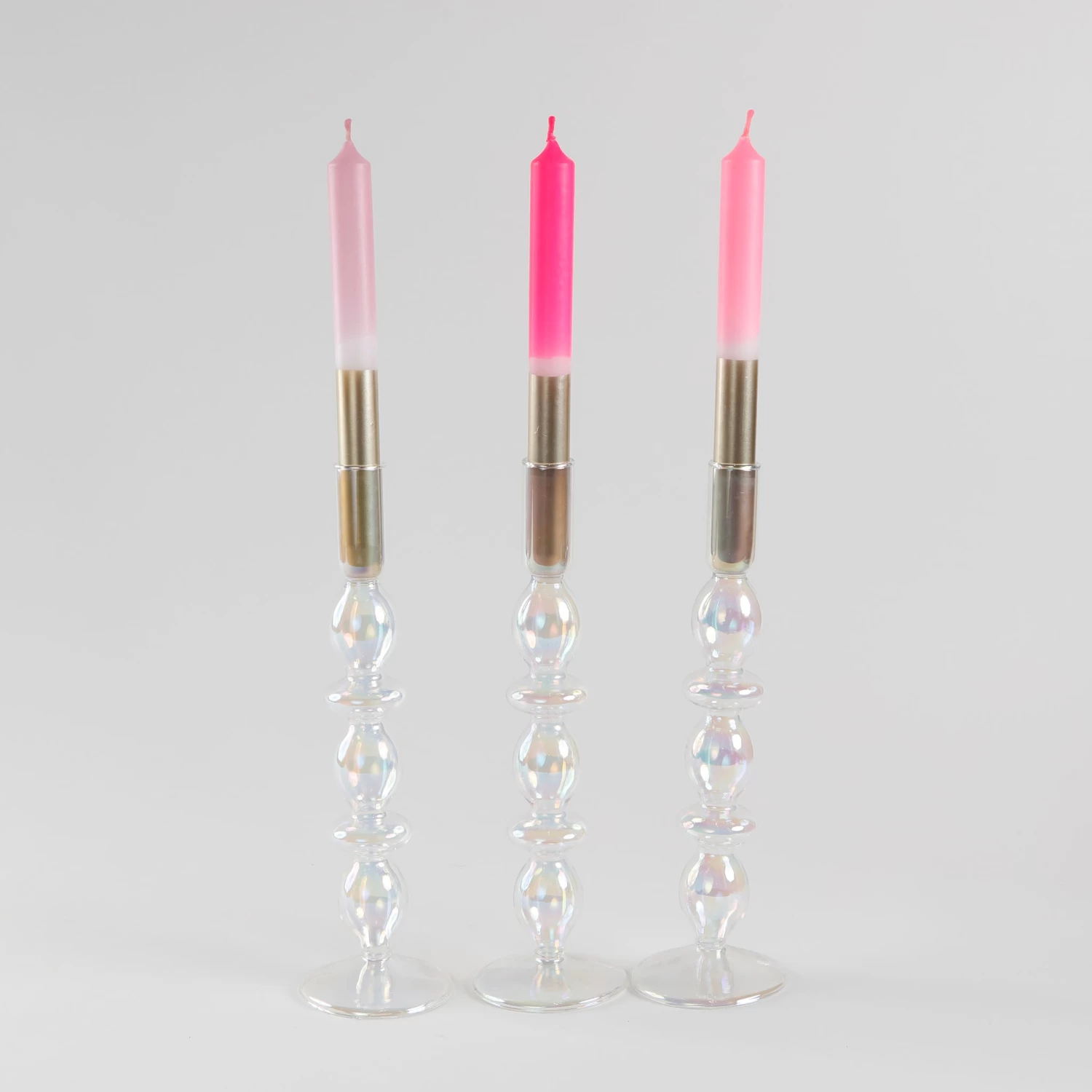 Brighten up your entryway or dinner party table setting with this set of 3 dip-dyed metallic taper candles with darling pink tops. Pink Stories Candles are handmade, making each color the same but every pattern special and unique. Dyed in cooperation with social institutions in the beautiful foothills of the Alps. 100% Vegan.