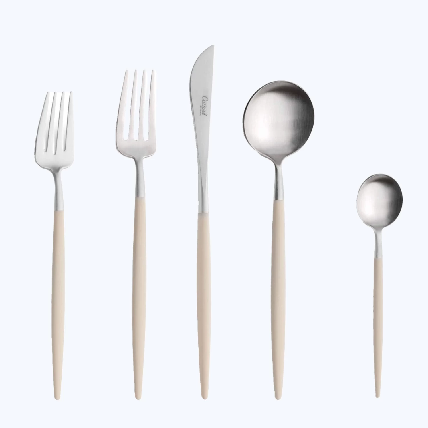 The intersection between modern design and traditional craftsmanship, Goa flatware is an ergonomic study in shapes. Refined in design, stainless steel is forged with elongated handles and dipped in sleek white resin for a balanced and controlled weight and feel. Cutipol sparks a creative force in traditional design.