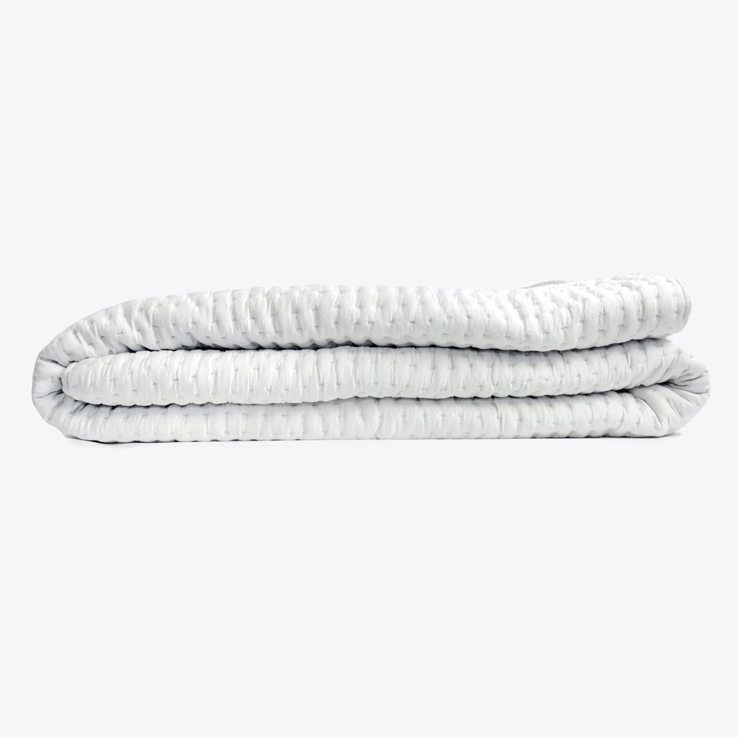 The classic hand stitched design of this white coverlet is enhanced with a relaxed pebbled texture and supple feel of soft cotton and silk.