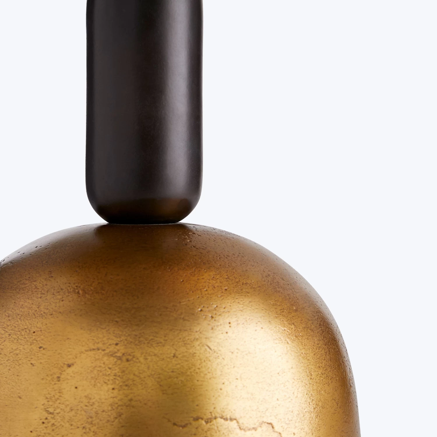 This side table features a scultural, geometric form composed of cast aluminum with a half-dome top and a bell-shaped bottom. Its antique brass finish with a bronze accent elevates this simple yet visually stunning design.