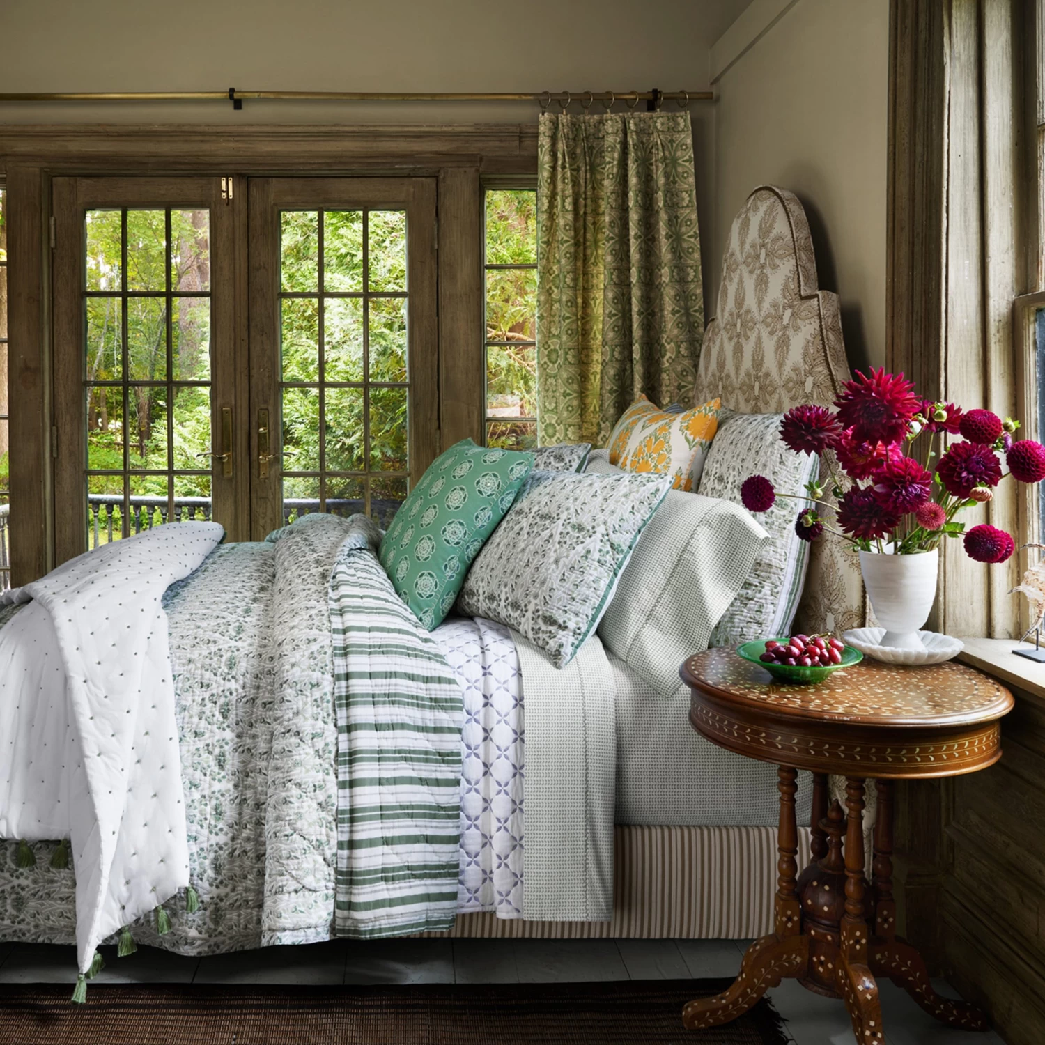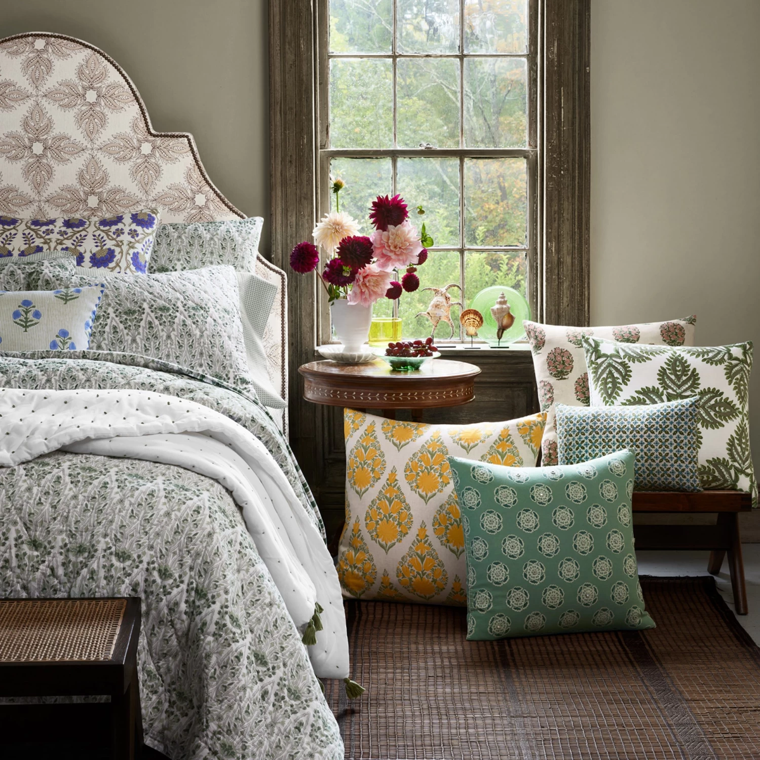 The Janna Decorative Pillow comes in a stately sage green. Featuring elegant medallions with mirror embellishments on the front, this pillow made from solid dyed cotton linen is a one-of-a-kind find.Featuring a distinct balance of bold and bright from old-world traditions and new-world style, John Robshaw displays an updated spin on traditional, handmade textiles with a vibrant mix of sophistication and romantic allure. Dying, printing, and experimenting alongside the artisans to create these unique fabrics, John Robshaw helps preserve traditional block printing, hand-stitching, hand-painting, and hand-quilting textiles in India.