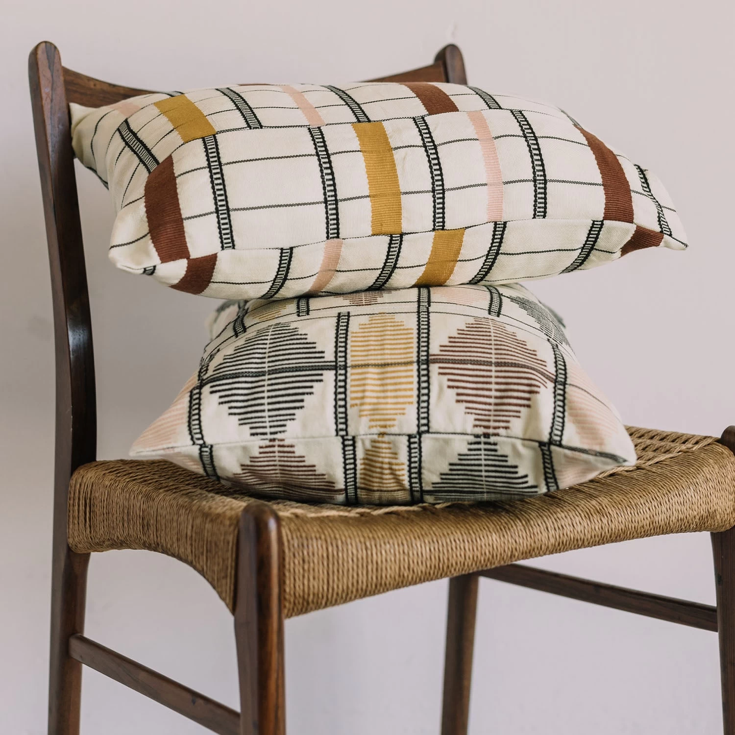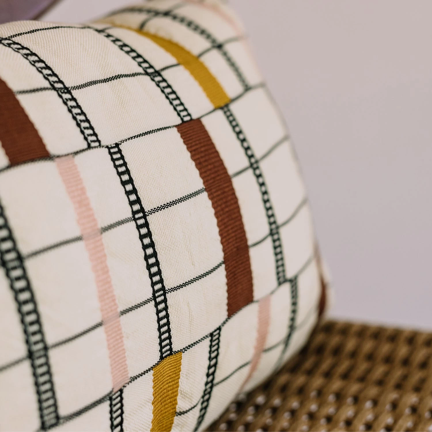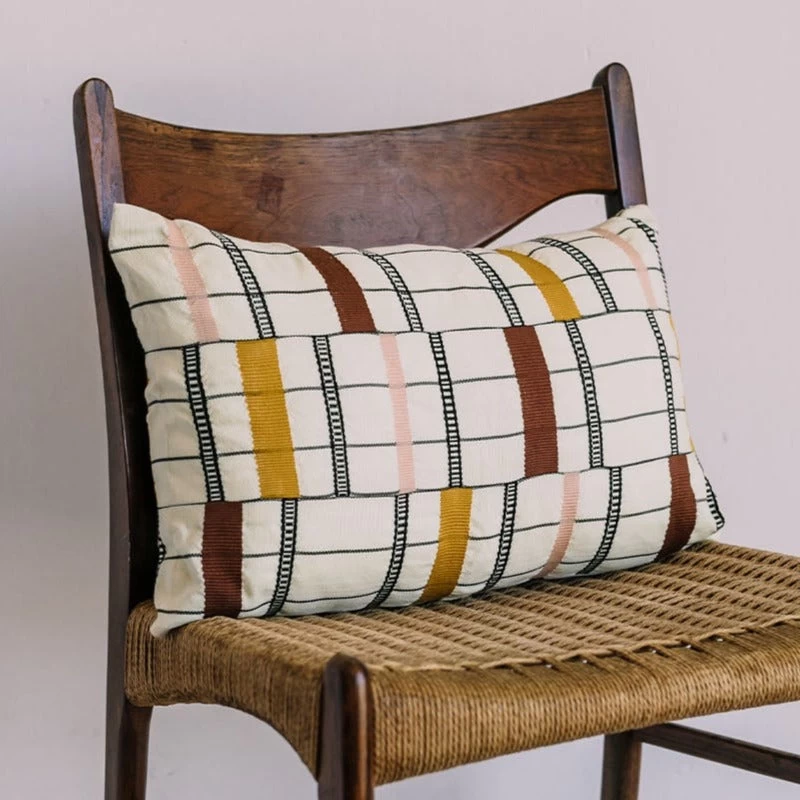 Handwoven with striking colors, this cotton cushion features a playful pattern with opposing stripes for movement and liveliness. Each piece is made by hand, and will feature slight variations in hue and form. As the piece is made from natural materials, colors may fade if left in direct sunlight for prolonged periods of time.