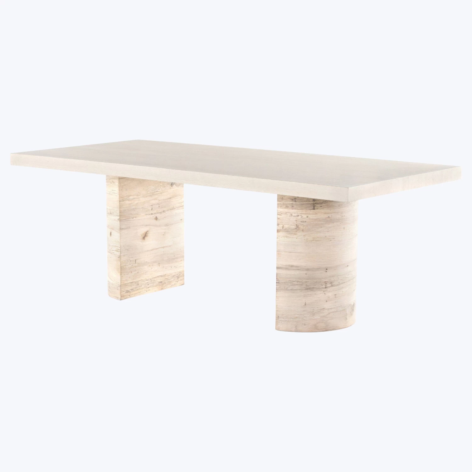 Organic in tone, sculptural in spirit. Inspired by bold Eighties-era design, a rectangular dining table of thick oak veneer features beautifully shaped legs in a bleached finish, with a pale tabletop for subtle contrast of tone. Seats six comfortably.