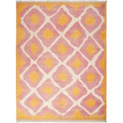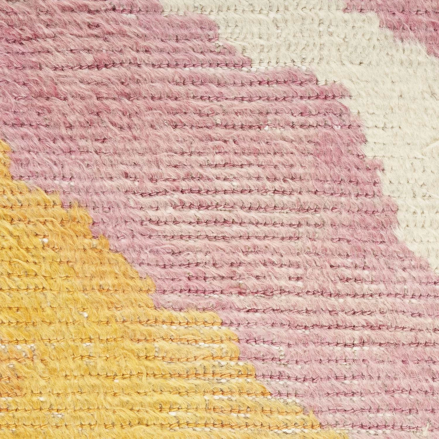 Whimsical in its re-interpretation, this Moroccan-style rug masterfully reduces a medley of vintage textile influences to its most essential form, translating the worlds of the embroidered Afghan suzani, the psychedelic Ikat, and the bold geometry of Moroccan motifs into a playful canvas of vibrant color. Handmade in Turkey from wool.