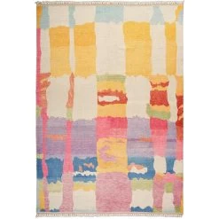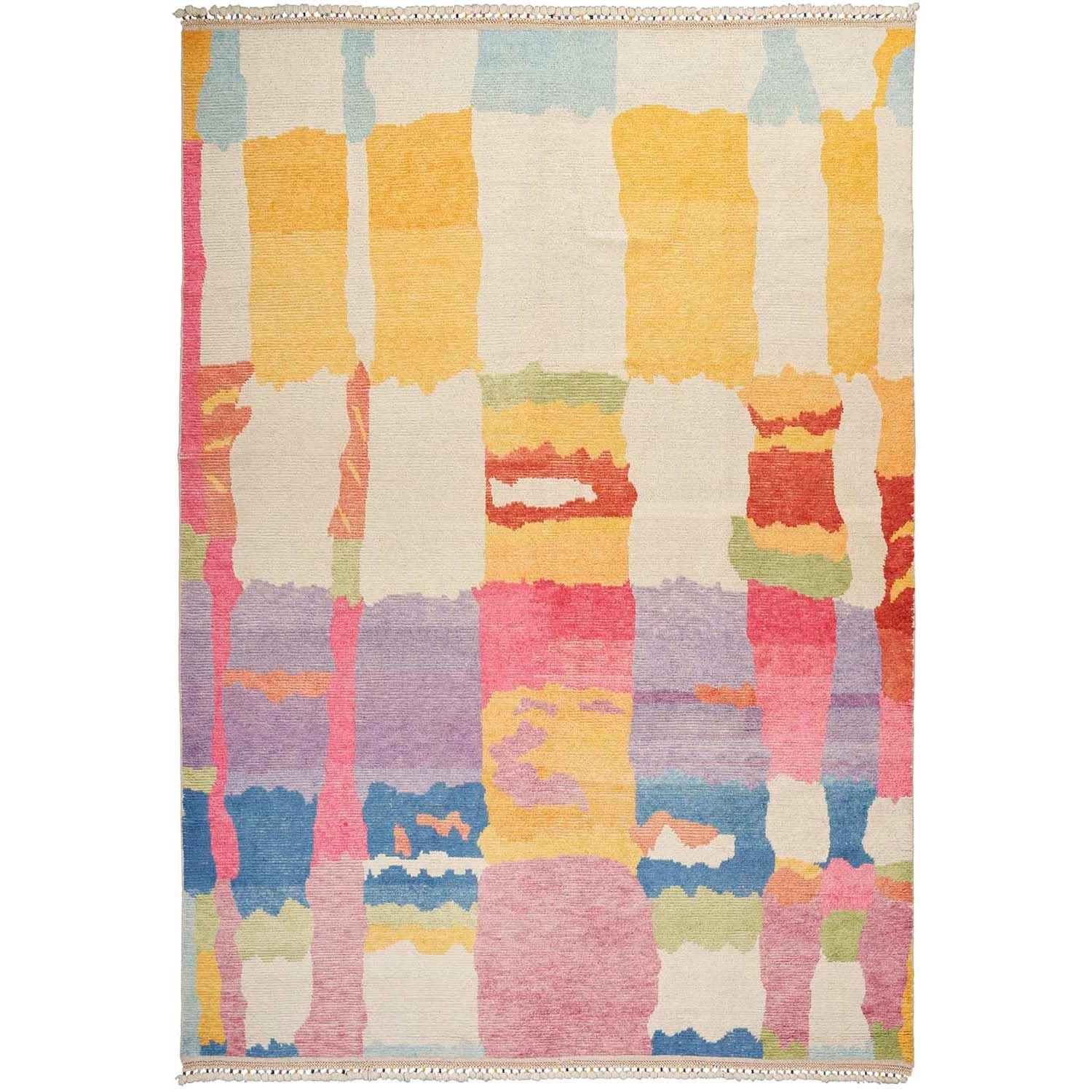 Whimsical in its re-interpretation, this Moroccan-style rug masterfully reduces a medley of vintage textile influences to its most essential form, translating the worlds of the embroidered Afghan suzani, the psychedelic Ikat, and the bold geometry of Moroccan motifs into a playful canvas of vibrant color. Handmade in Turkey from wool.
