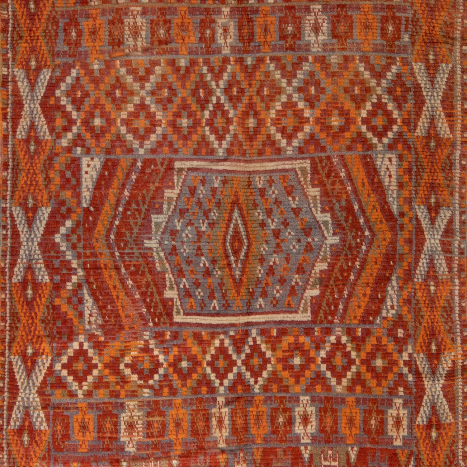 Hand-knotted by skilled artisans, this Orange and Red Moroccan Wool Runner 4’9″ x 10′ features an intricate geometric pattern in vibrant shades of orange and red with light blue accents. Crafted from high-quality and durable wool, this Moroccan runner rug showcases intricate details and texture, creating a beautiful focal point in your entryway, living room, dining room, or bedroom. Experience the warmth and elegance it brings to your space. Finished with a twisted rope border.