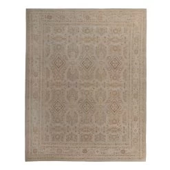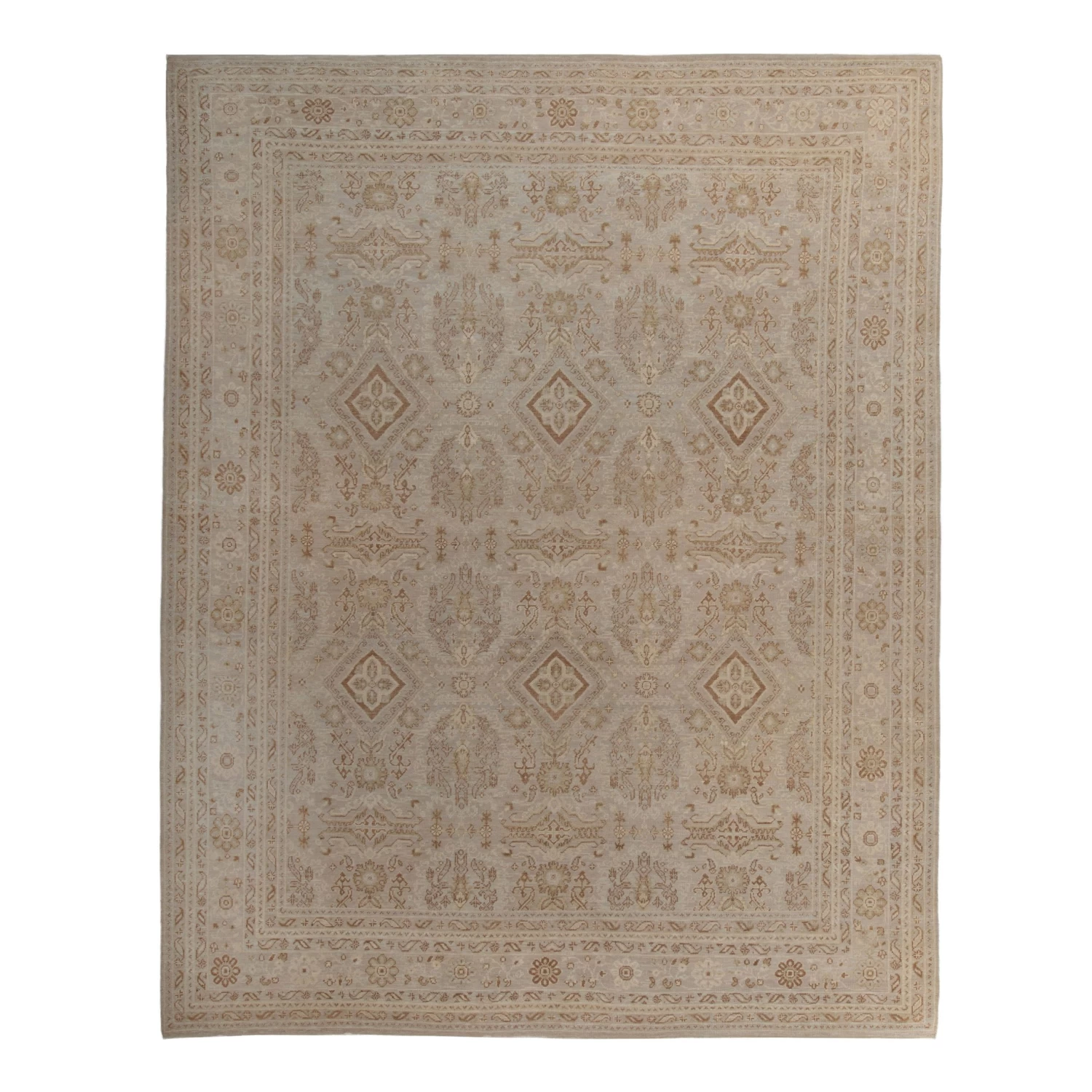 The Natural Transitional Silk Rug – 11’10” x 14’9″ features a detailed pattern on a neutral background, with repeating ornamental elements including geometric shapes and floral motifs. The border boasts an intricate design, giving it a framed look. Hand knotted out of silk in India, this high-end transitional rug exudes timeless elegance.