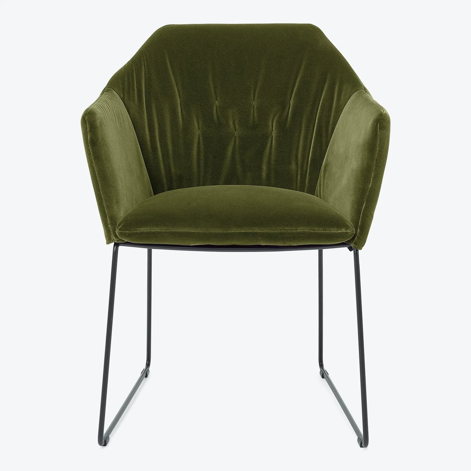 The dining chair counterpoints romantic plush velvet with a sleek metal frame. The geometric form is softened by a padded seat and back. Exclusively ours, handmade in Italy. Complete with a removable slipcover for easy cleaning or changing up your look, this piece makes light work of dining and entertaining. Shop the entire Saba collection available at abc.