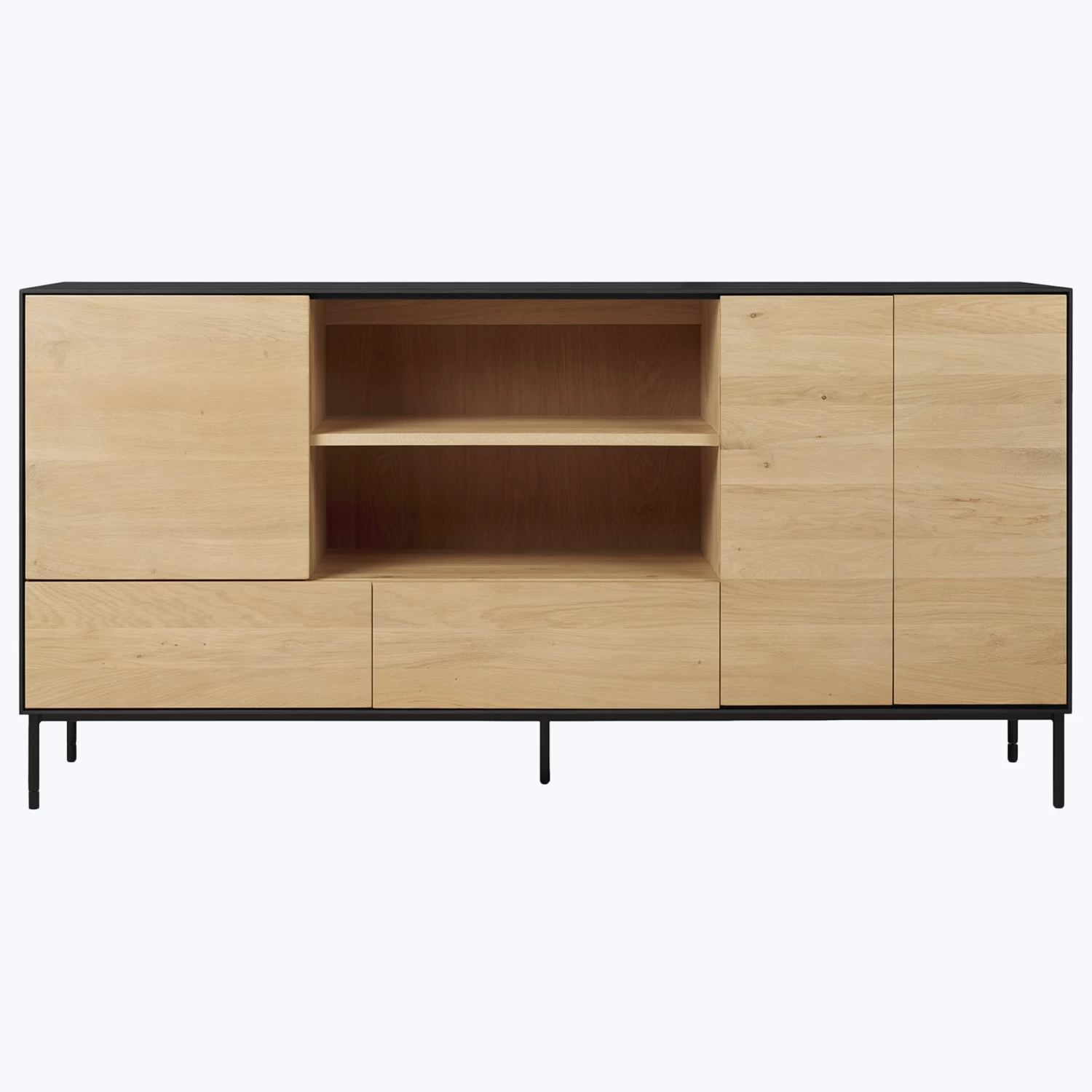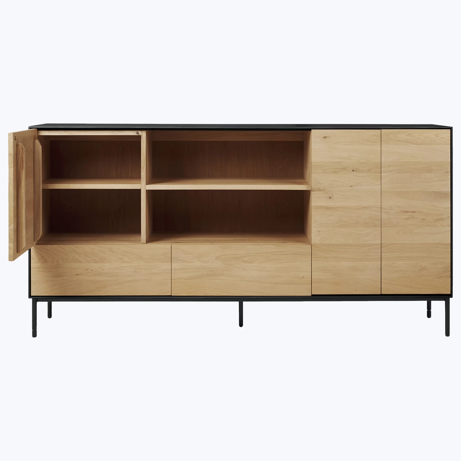 Clean and simple construction evokes modern simplicity. Solid oak and sleek lines become one in this polished sideboard. High contrast black varnish stained wood subtly grabs the eye as light wood doors and drawers offer an abundance of space for all storage needs.