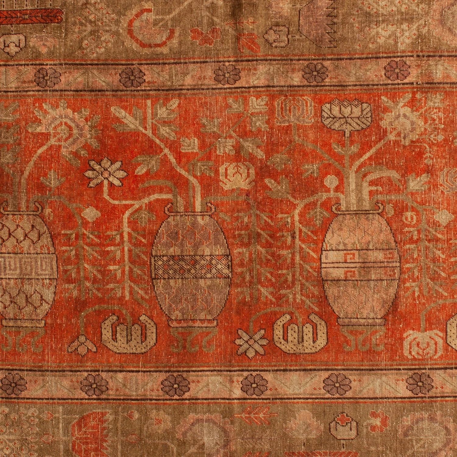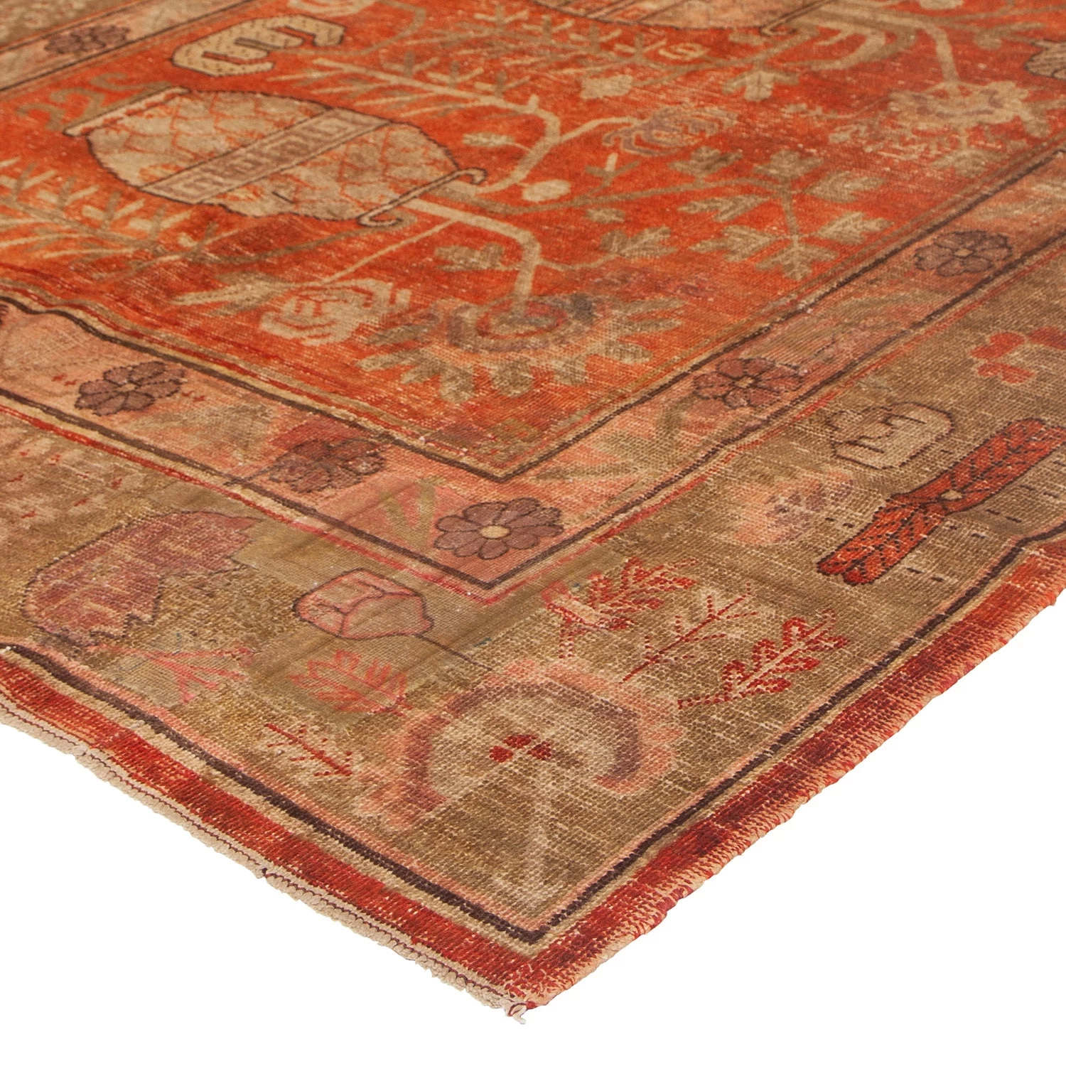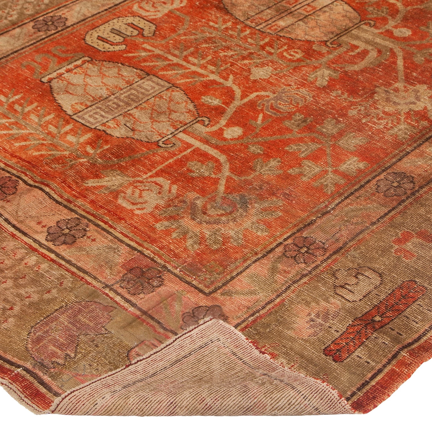 Elevate your home decor with this exquisite Orange Vintage Traditional Wool Kohtan Rug – 5’4″ x 10’8″ handwoven rug, crafted from luxurious handspun wool. With a traditional design inspired by the field pattern of an antique Khotan carpet, this ’60s era vintage rug is a stunning work of art that adds timeless elegance to any living space. Expertly embroidered on a traditional ground loom using only the finest quality vegetable-dyed, handspun wool, this rug is not only breathtakingly beautiful but also incredibly durable and long-lasting. Treat yourself to the ultimate in style and quality with this one-of-a-kind handwoven rug that is sure to impress.