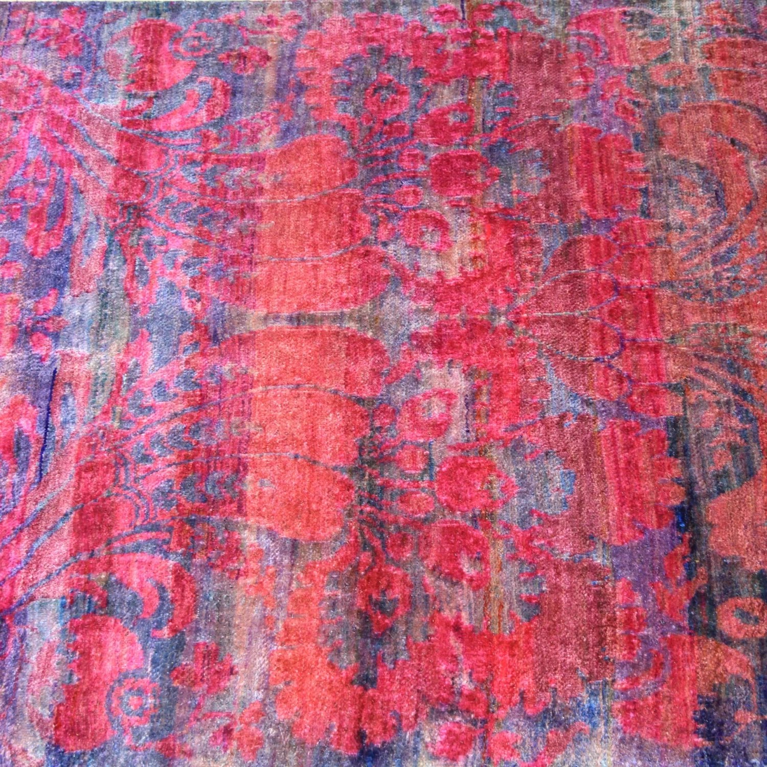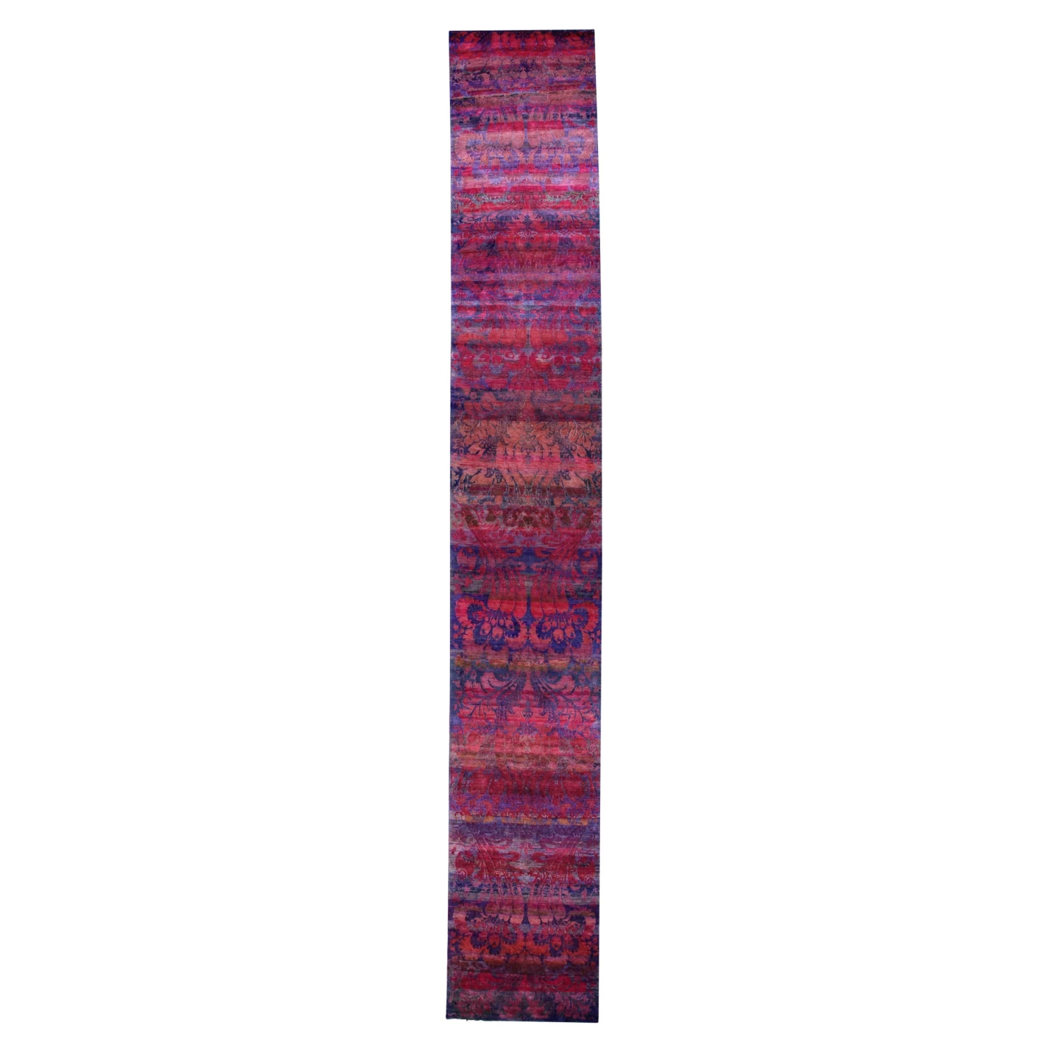 A traditional pattern influenced by Samarkand Khotan motifs and sacred geometry emerges from a bright background thanks to an antique wash in this Pink and Purple Transitional Silk Runner – 3′ x 21’10”. Handmade in India from upcycled silk, this one-of-a-kind runner rug from our Alchemy collection reimagines iconic vintage motifs in a spectrum of vibrant pink and purple hues with balanced accents of brown and blue.