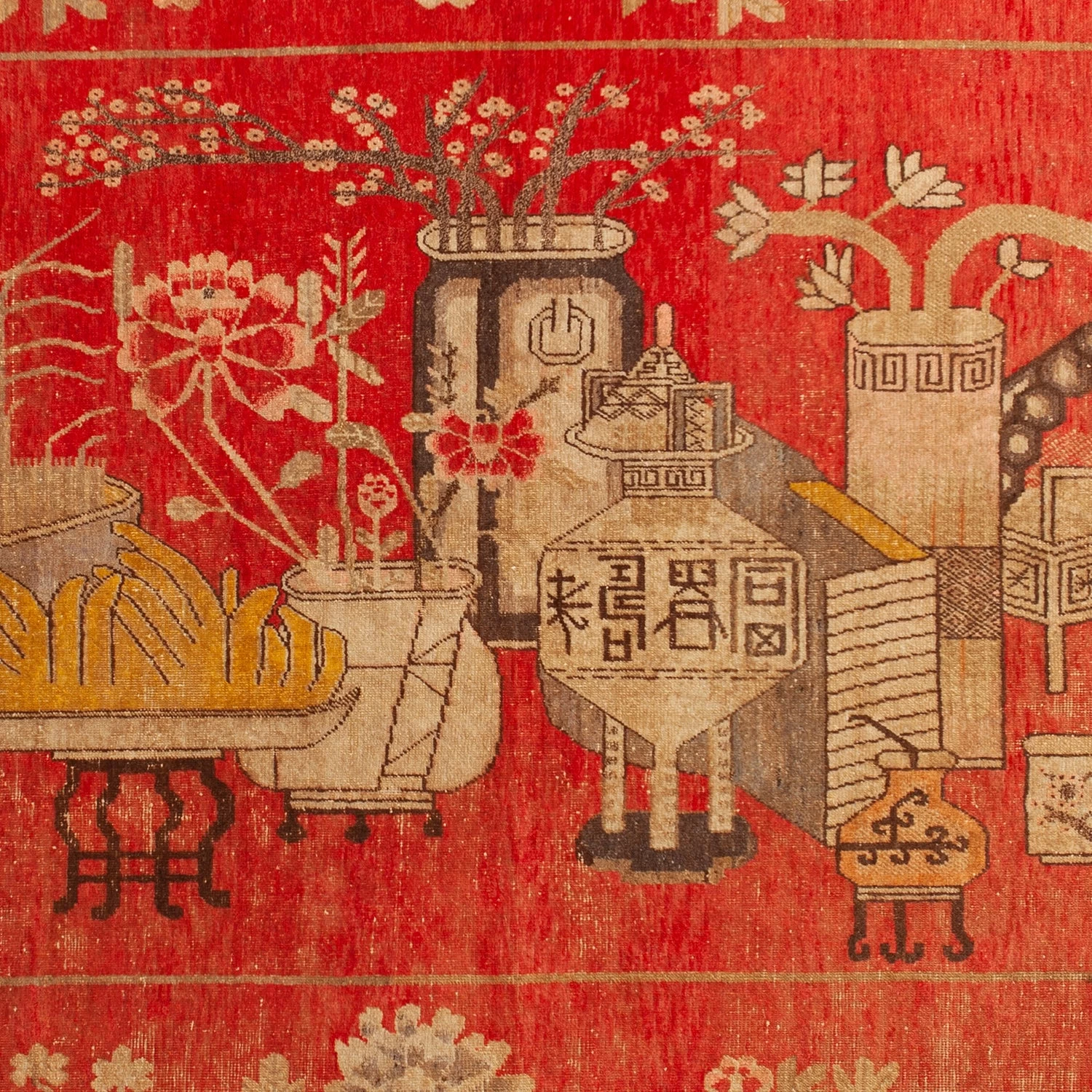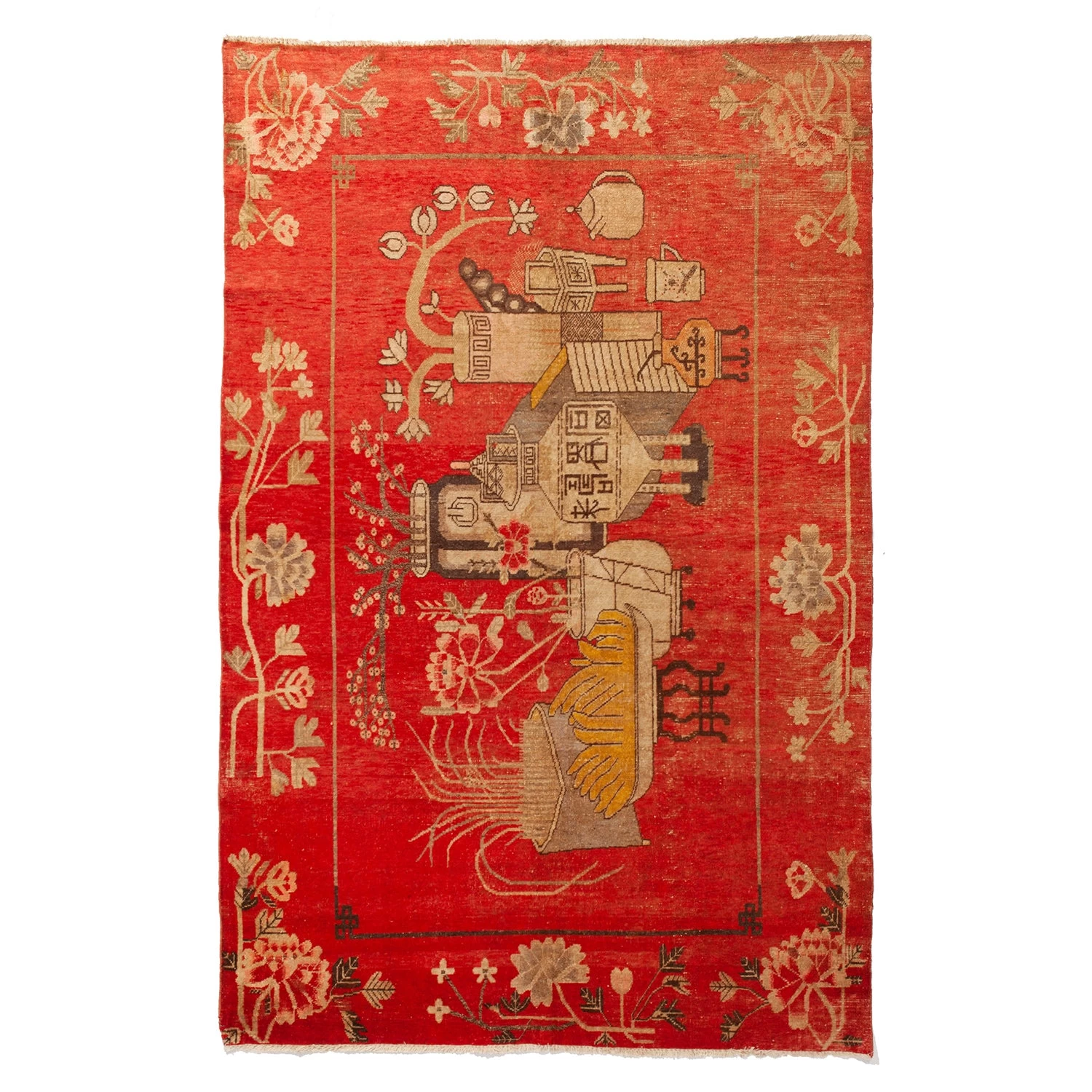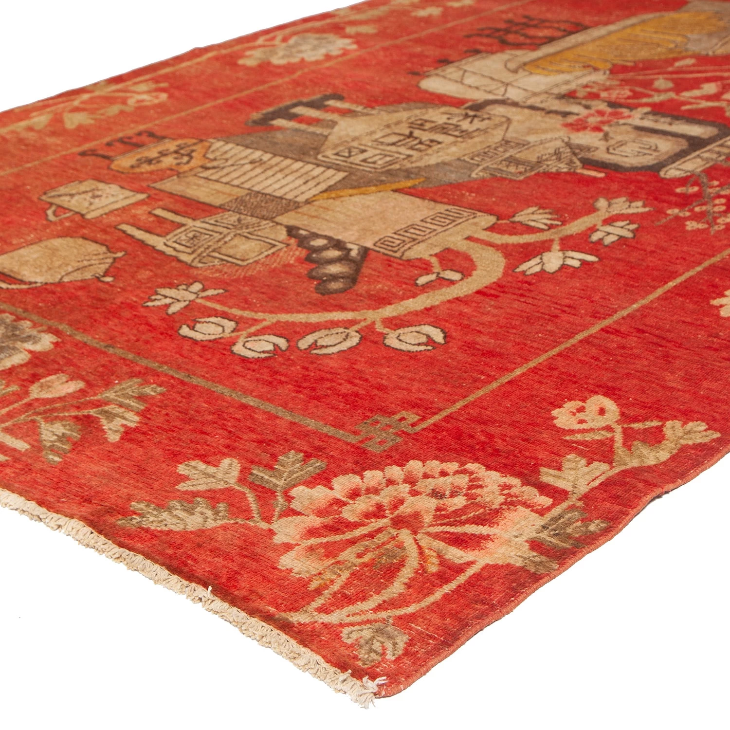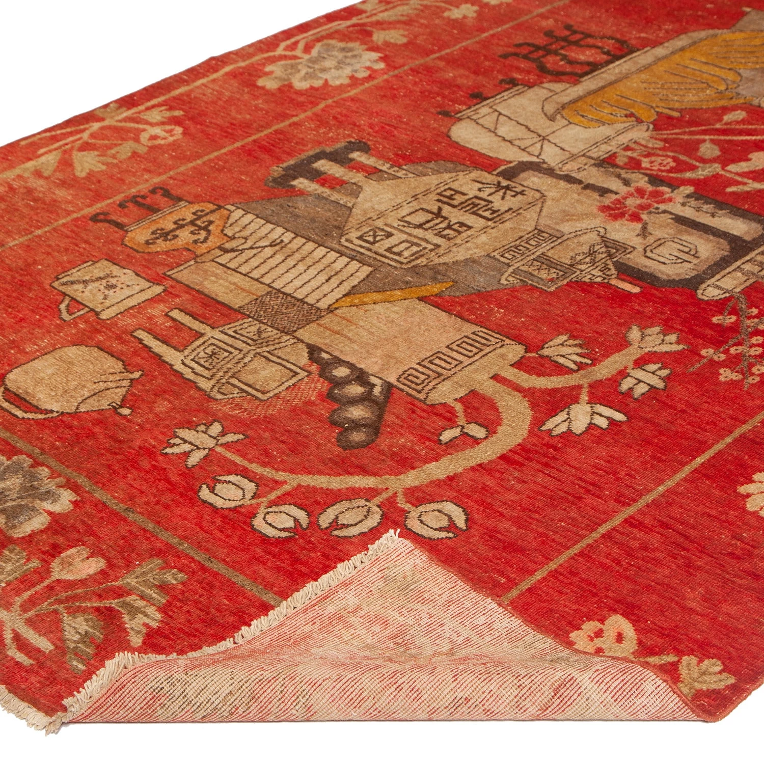 Elevate your home decor with this exquisite Red Vintage Traditional Kohtan Wool Rug – 5’5″ x 8’5″ handwoven rug, crafted from luxurious handspun wool. With a traditional design inspired by the field pattern of an antique Khotan carpet, this ’60s era vintage rug is a stunning work of art that adds timeless elegance to any living space. Expertly embroidered on a traditional ground loom using only the finest quality vegetable-dyed, handspun wool, this rug is not only breathtakingly beautiful but also incredibly durable and long-lasting. Treat yourself to the ultimate in style and quality with this one-of-a-kind handwoven rug that is sure to impress.