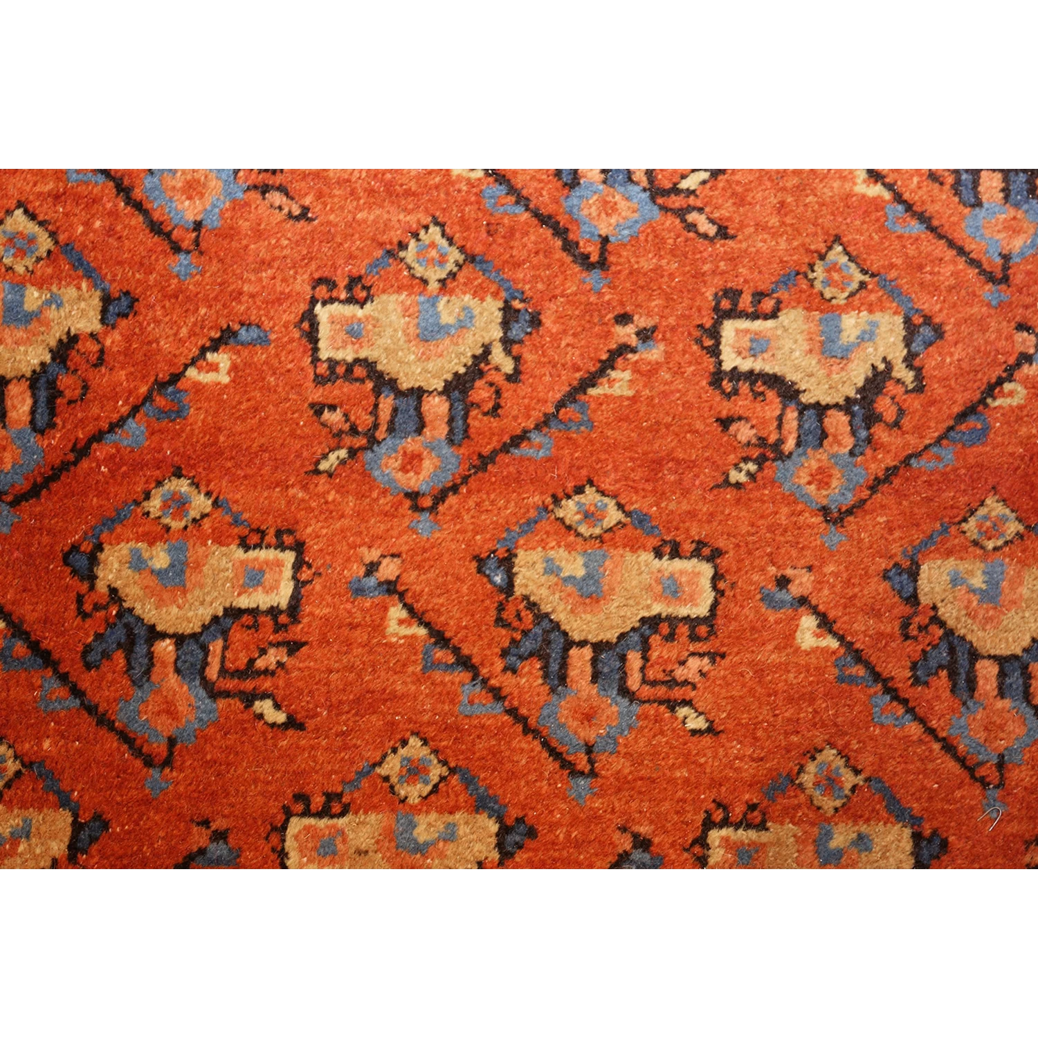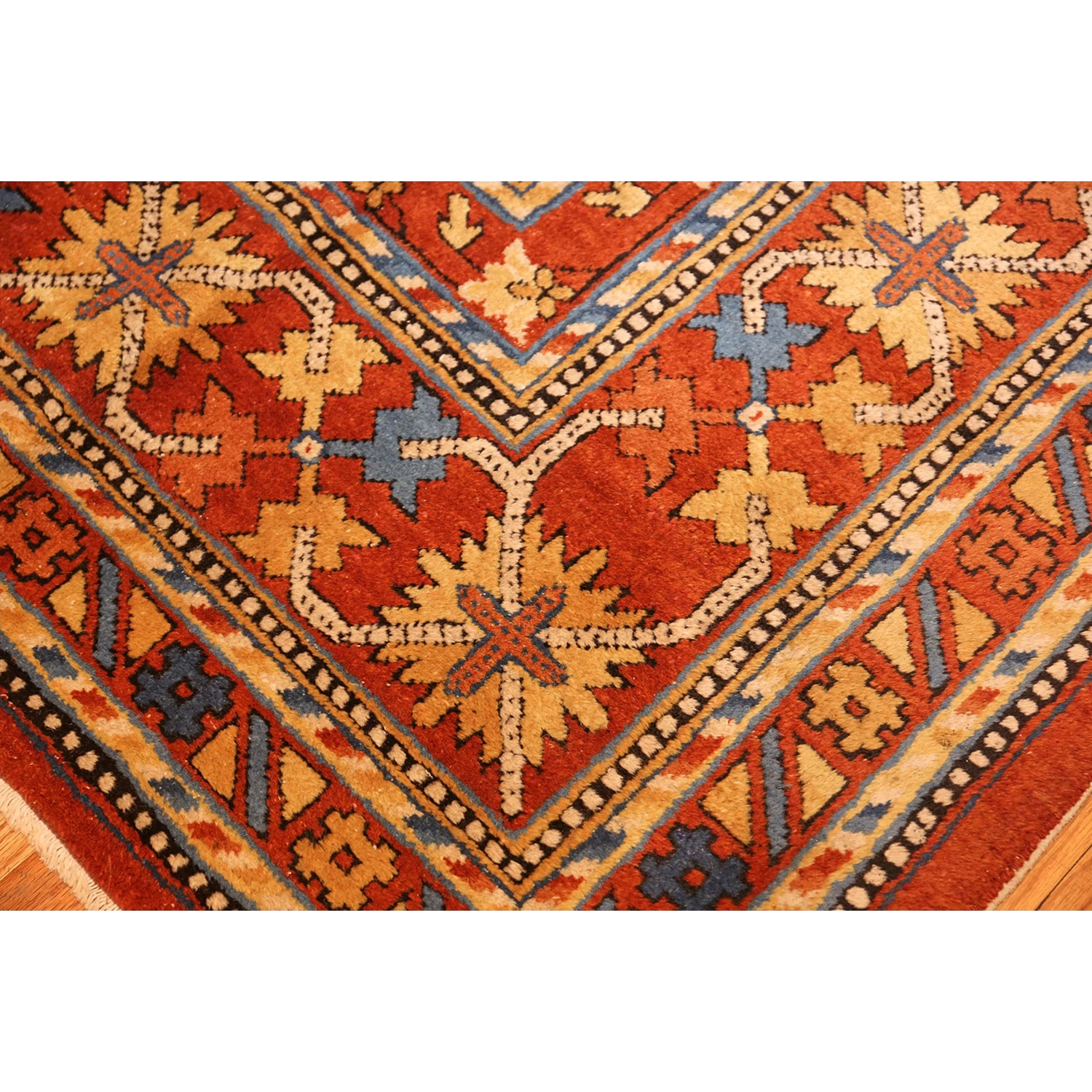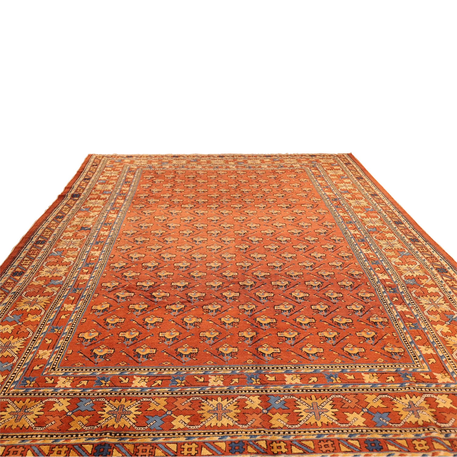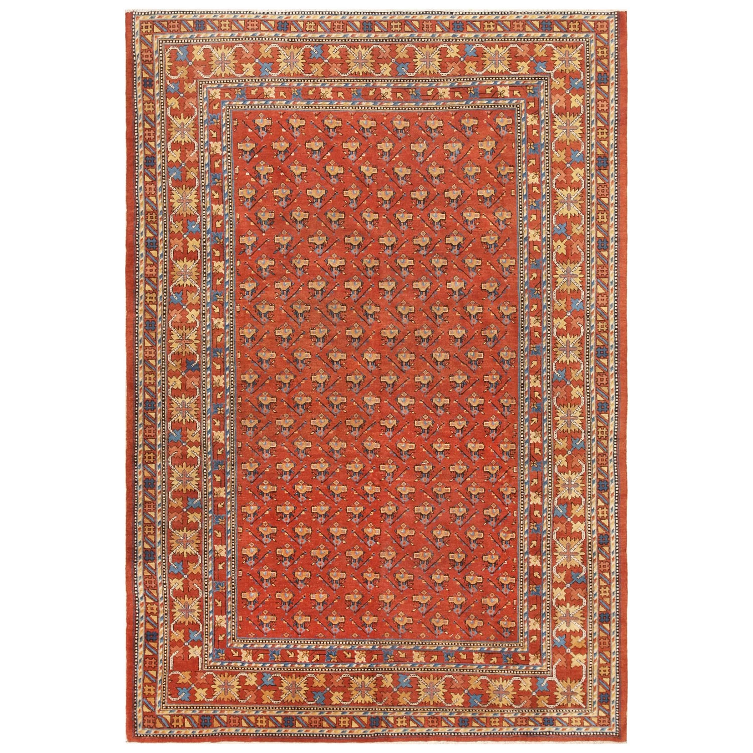 This Red Vintage Tribal Khotan Rug – 8’5″ x 12′ is a rare larger size of a traditional East Turkestan Khotan rug from the famed Silk Road. Hand-knotted in the early 20th century, this captivating one-of-a-kind rug is reminiscent of tribal designs from the past with its famed harshang crab design on the border to the repeating motif within the center field.